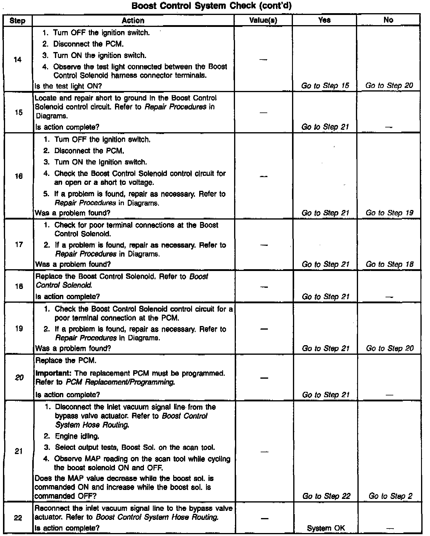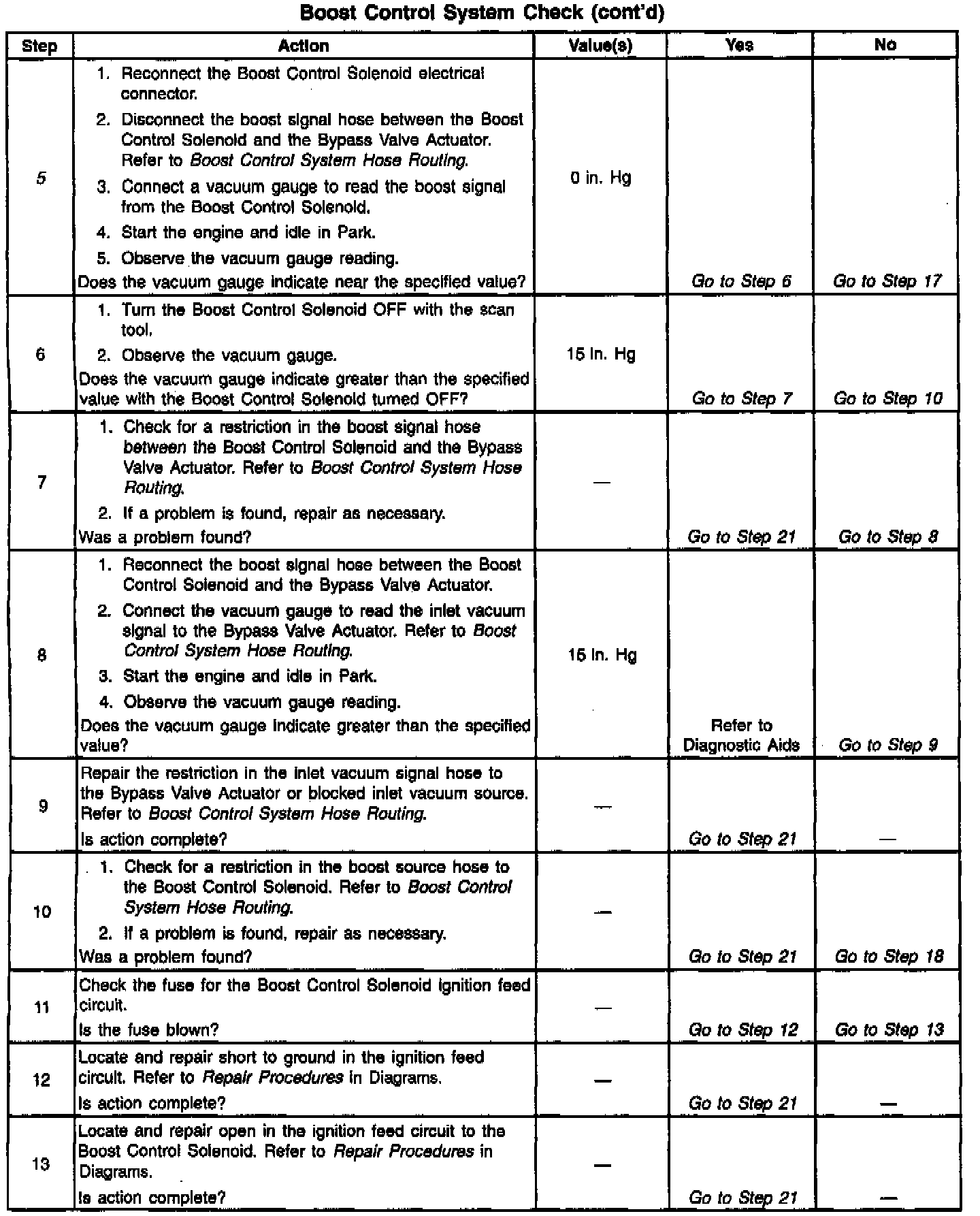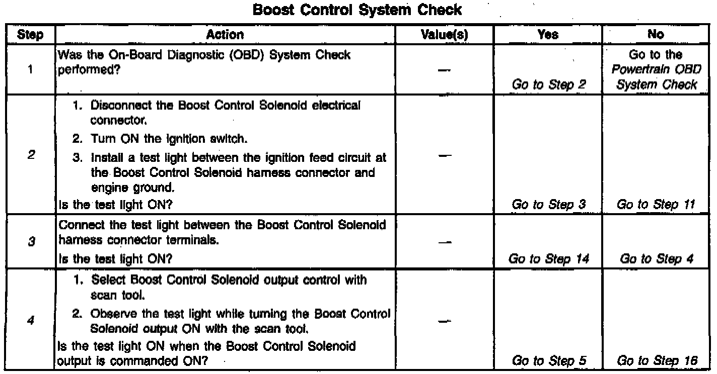 If the Boost Control System Check has been performed and no electrical or vacuum related fault is noted, check for the following conditions: