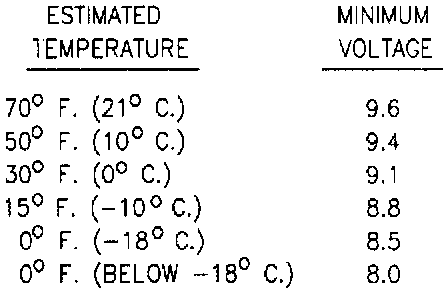 E. If voltage does not drop below the minimum listed, the battery is good and should be returned to service. (The battery temperature must be estimated by feel and by the temperature the battery has been exposed to for the proceeding few hours).