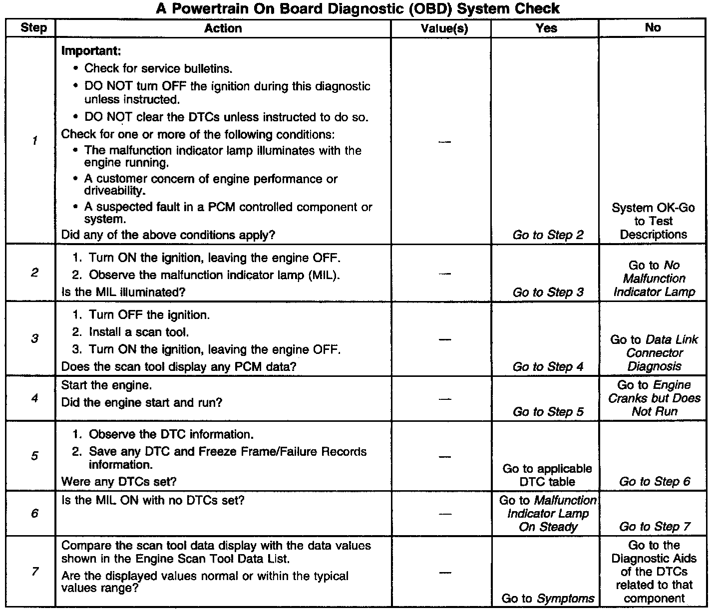The Powertrain OBD system check is an organized approach to identifying a problem created by an electronic engine control system malfunction. The Powertrain OBD system check is the starting point for any driveability concern diagnosis, because it directs the service technician to the next logical step in diagnosing the concern. Understanding the table and using it correctly will reduce diagnostic time and prevent the replacement of good parts.