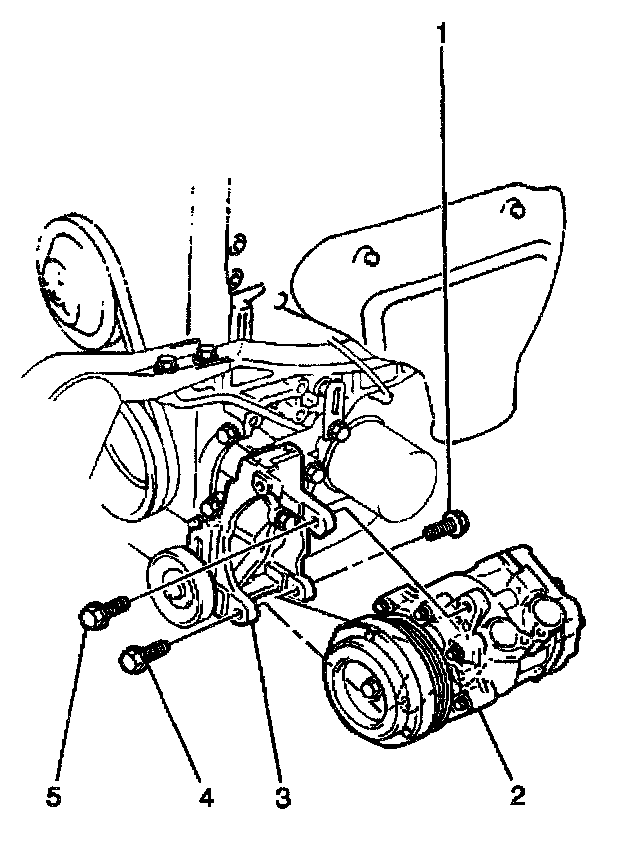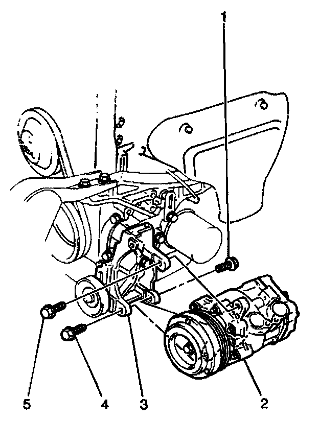 10. Remove the 4 bolts (3,4,5) and the compressor mounting bracket from the vehicle.