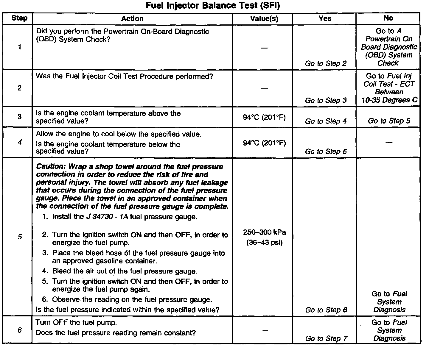 6. This step checks for a steady fuel pressure reading. If the fuel pressure reading indicated is not steady, refer to Fuel System Diagnosis.