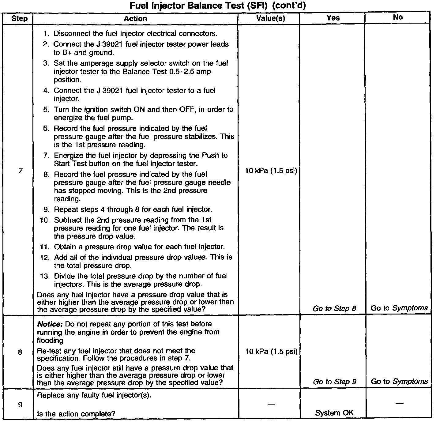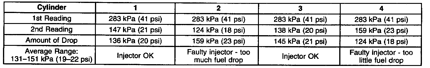 7. The fuel injectors are flowing properly if the pressure drop value for each fuel injector is within 10 kPa (1.5 psi) of the average pressure drop value. Calculate the pressure drop value for each fuel injector by subtracting the second pressure reading from the first pressure reading. Refer to the examples in the table.