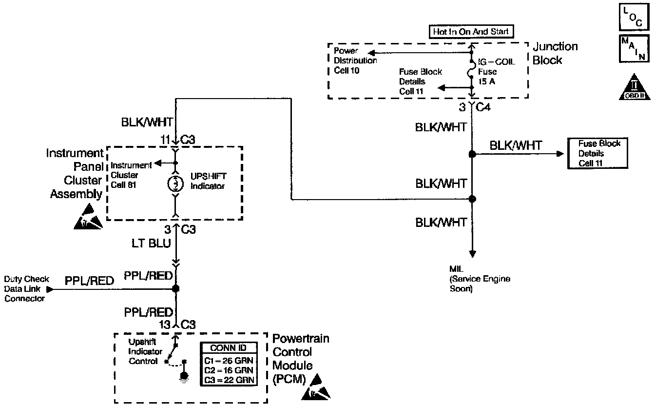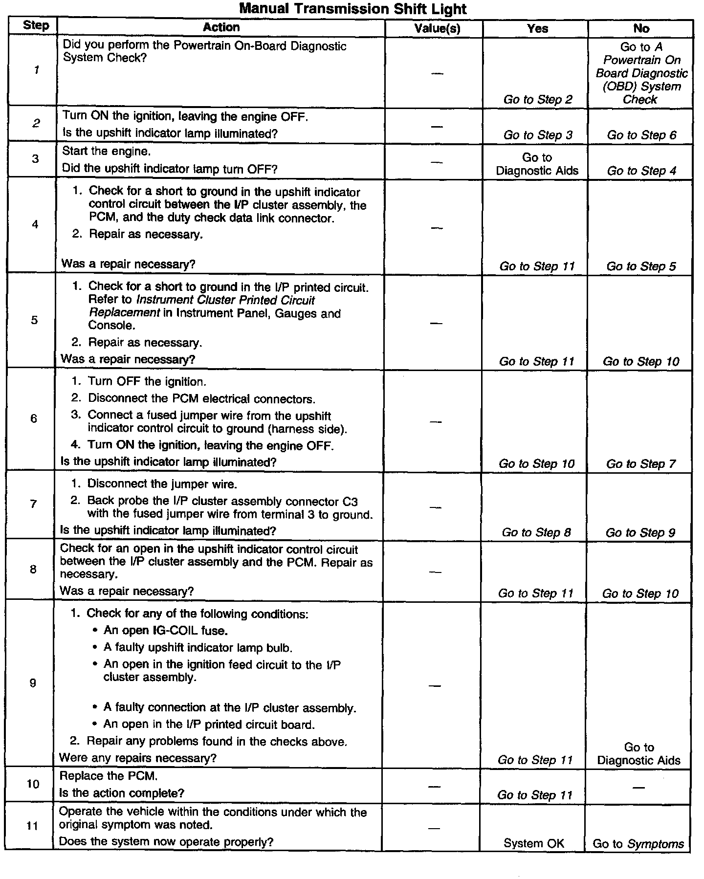 The upshift indicator lamp is controlled by the powertrain control module (PCM). The upshift indicator lamp is illuminated when the upshift indicator control circuit from the I/P cluster assembly is grounded by the PCM. The upshift indicator lamp will be illuminated all the time if the lamp control circuit is shorted to ground. The lamp will not illuminate when commanded by the PCM if the upshift indicator lamp circuit is open.