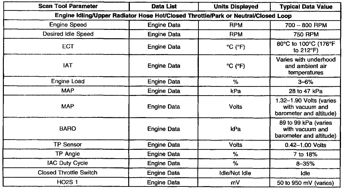 The scan tool data parameters listed below are the only parameters referenced in this service manual for use in diagnosis. If all scan tool data values are within the typical ranges described below, refer to Symptoms for additional diagnosis. Testing and Inspection