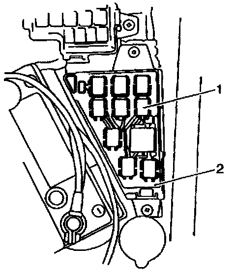 14. Reconnect the Main Relay (1) to the Relay Box (2).
