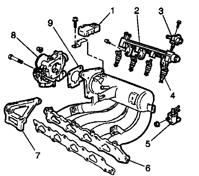 Install the intake manifold with the TBI unit (8) and wire clamps to the cylinder head still attached. Secure the intake manifold with the two nuts and the seven bolts. Tighten the intake manifold mounting bolts and nuts to 23 Nm (17 lb ft).