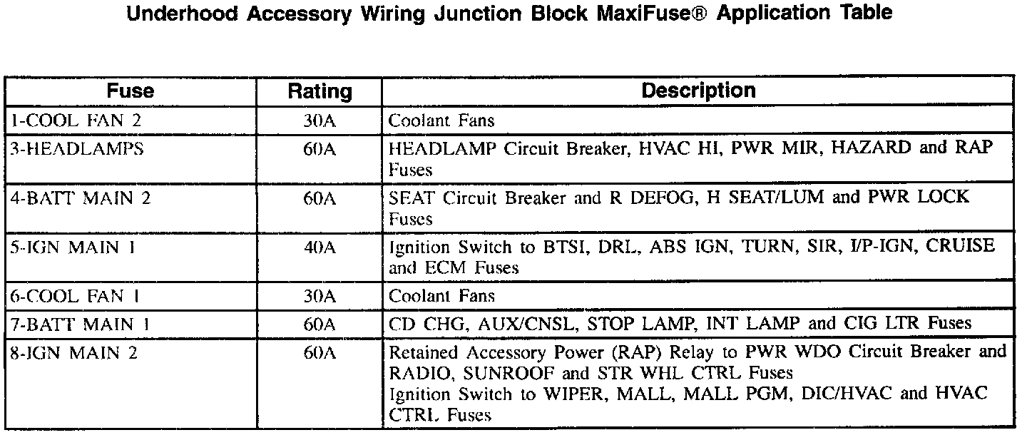 Underhood Accessory Wiring Junction Block Maxifuse (R) Application Table: