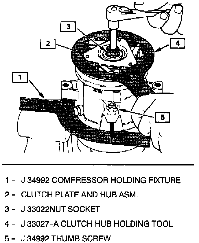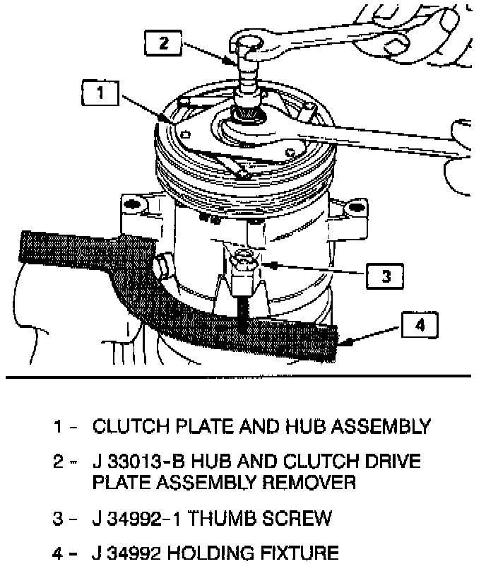 1. Clamp the holding fixture J 34992 in a vise and attach compressor to holding fixture with thumb screws J 34992-1.