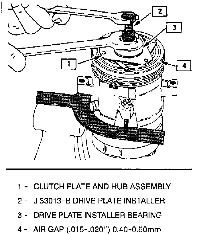 6. Hold the center screw with a wrench. Tighten the hex portion of the installer J 33013-B body to press the hub onto the shaft. Tighten the body several turns, remove the installer and check to see that the shaft key is still in place in the keyway before installing the clutch plate and hub assembly to its final position. The air gap between frictional surfaces of the clutch plate and clutch rotor should be 0.40-0.50mm (0.015-0.020").
