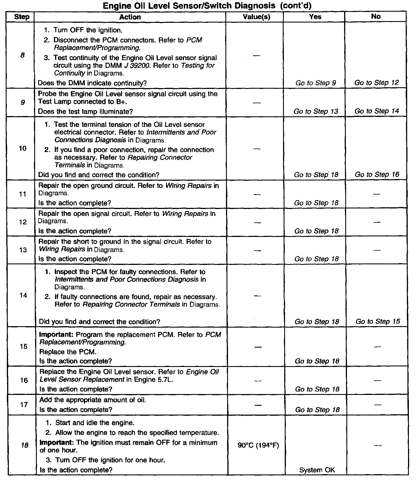 9. This step tests the Oil Level signal circuit for a short to ground.