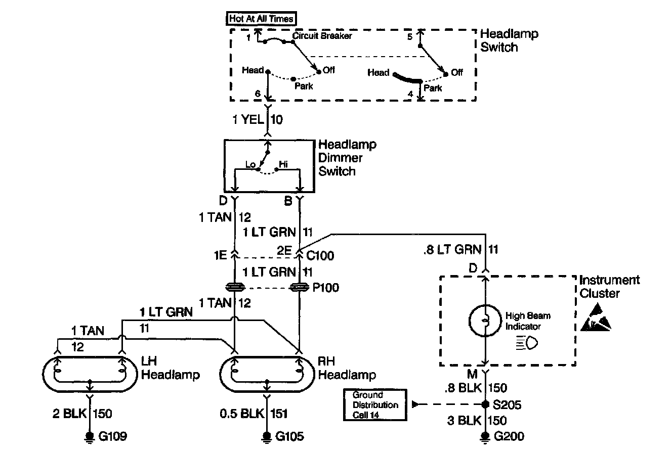 At this point analyze and (diagnose the problem), and develop text. Since the high beam indicator illuminated when the headlamp dimmer switch was in the high position, the high contacts of the headlamp dimmer switch and the LT GRN wire between the headlamp dimmer switch and C100 are good. At this point, it is extremely unlikely that the high beam filaments in the RH and LH headlamps are both open or that both headlamp connections are bad. The cause must be a bad connection at C100 or an open in the LT GRN wire between C100 and the RH headlamp.