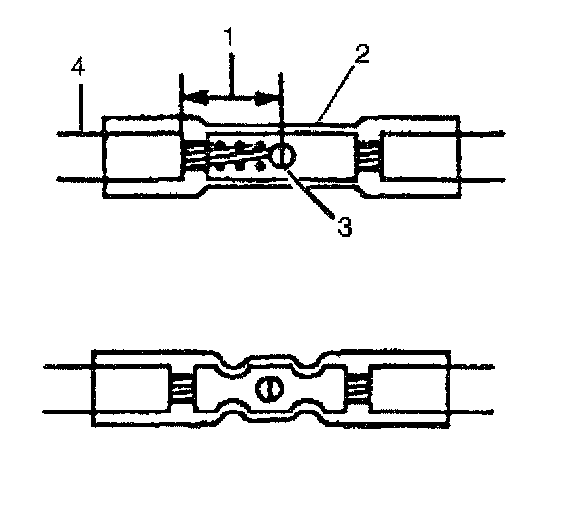 9. Insert the wires into the splice sleeve until the wire hits the barrel stop. The splice sleeve has a stop in the middle of the barrel in order to prevent the wire from passing through the splice (3).