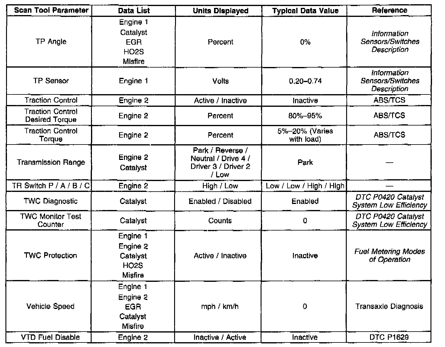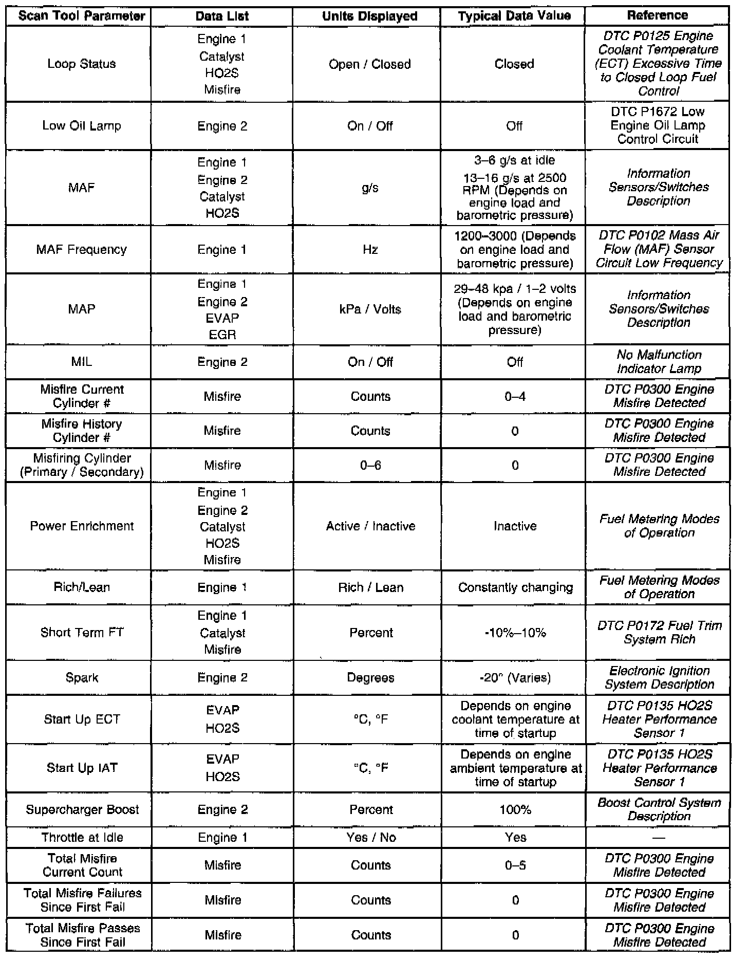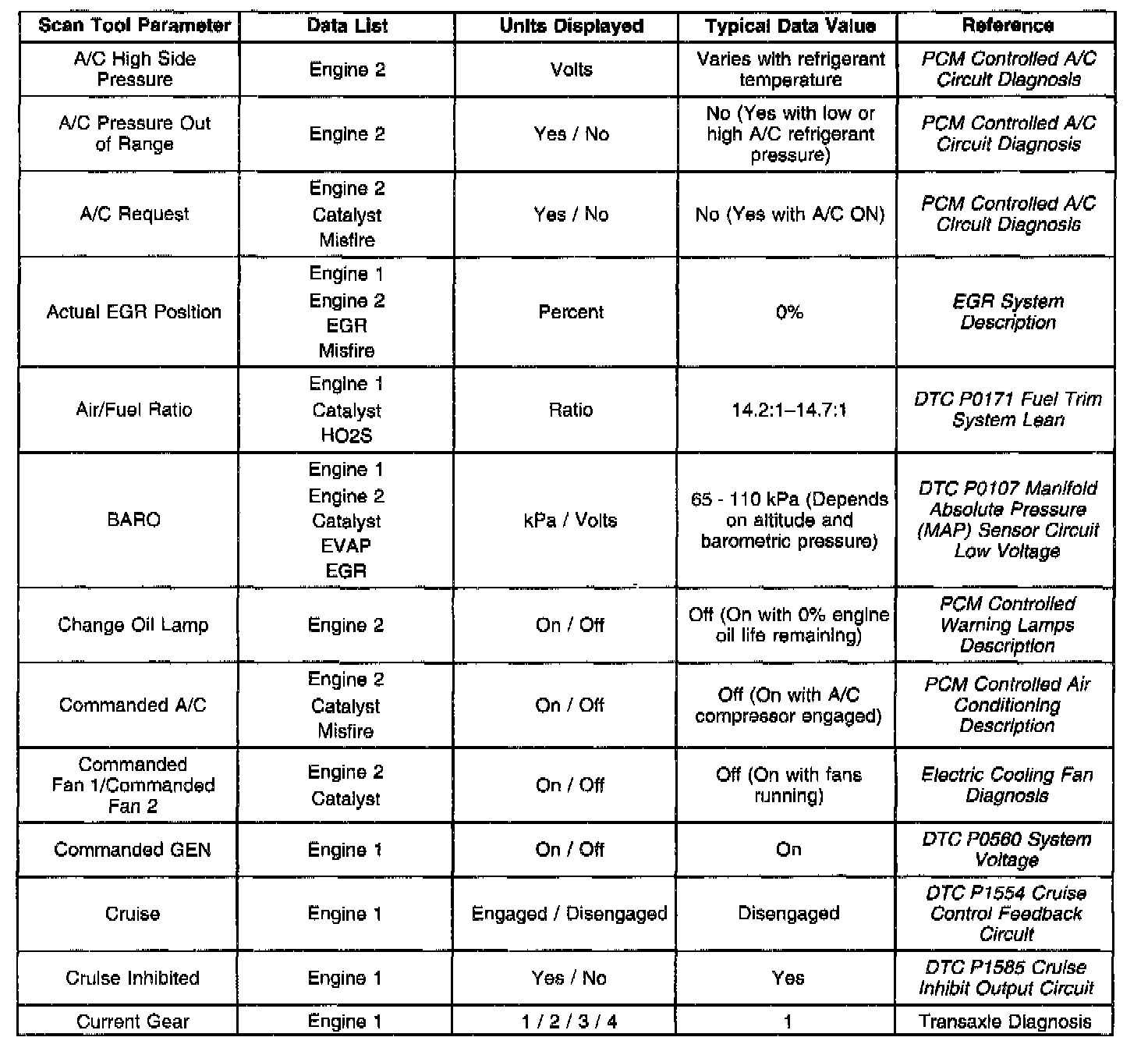 Only the parameters listed below are referred to in this service manual for use in diagnosis. For further information on using the scan tool to diagnose the PCM and related sensors, refer to the applicable reference section listed below. If all values are within the typical range described below, refer to Symptoms for diagnosis. The Typical Scan Data Values table contains all the parameters included in the following data lists arranged in alphabetical order: