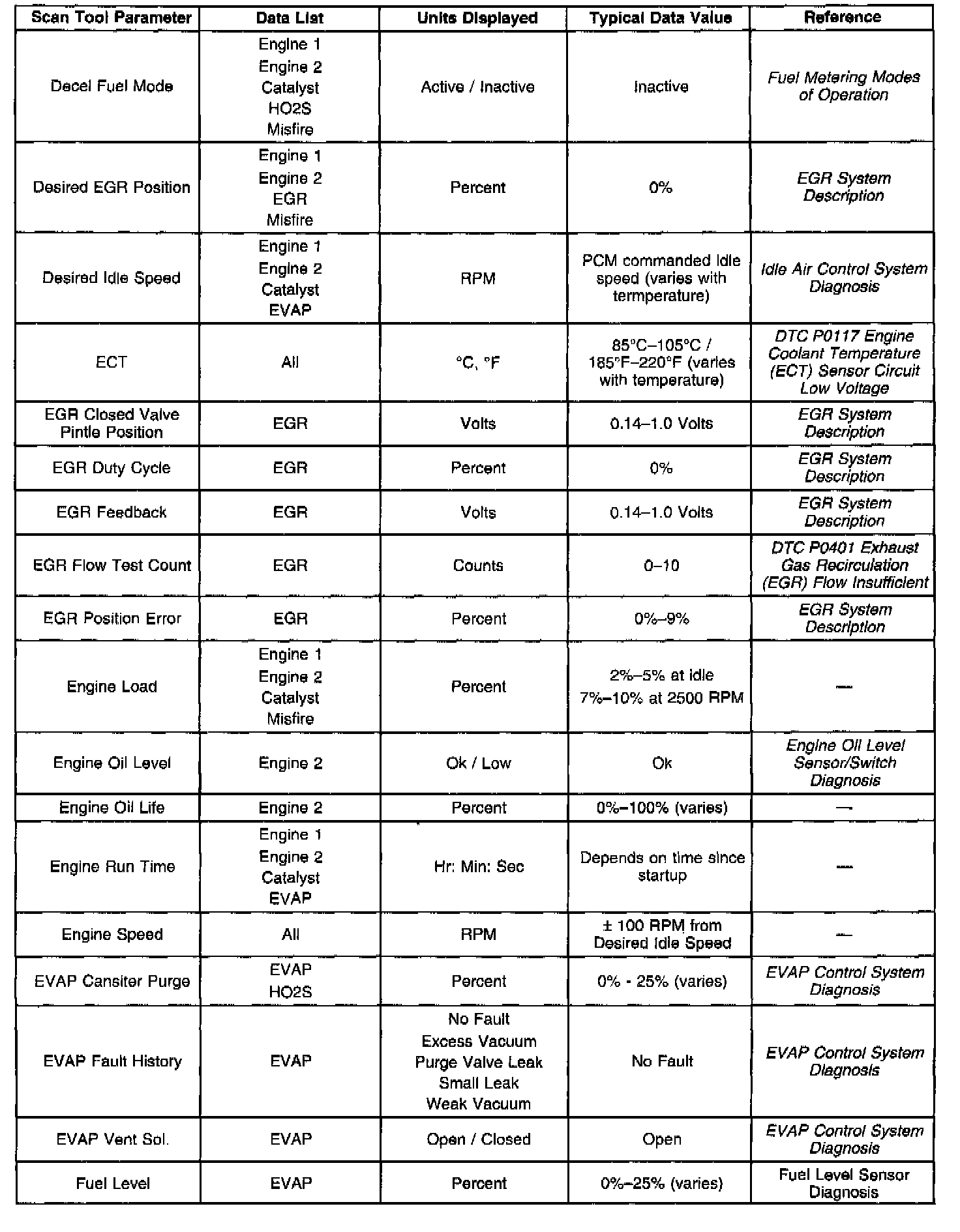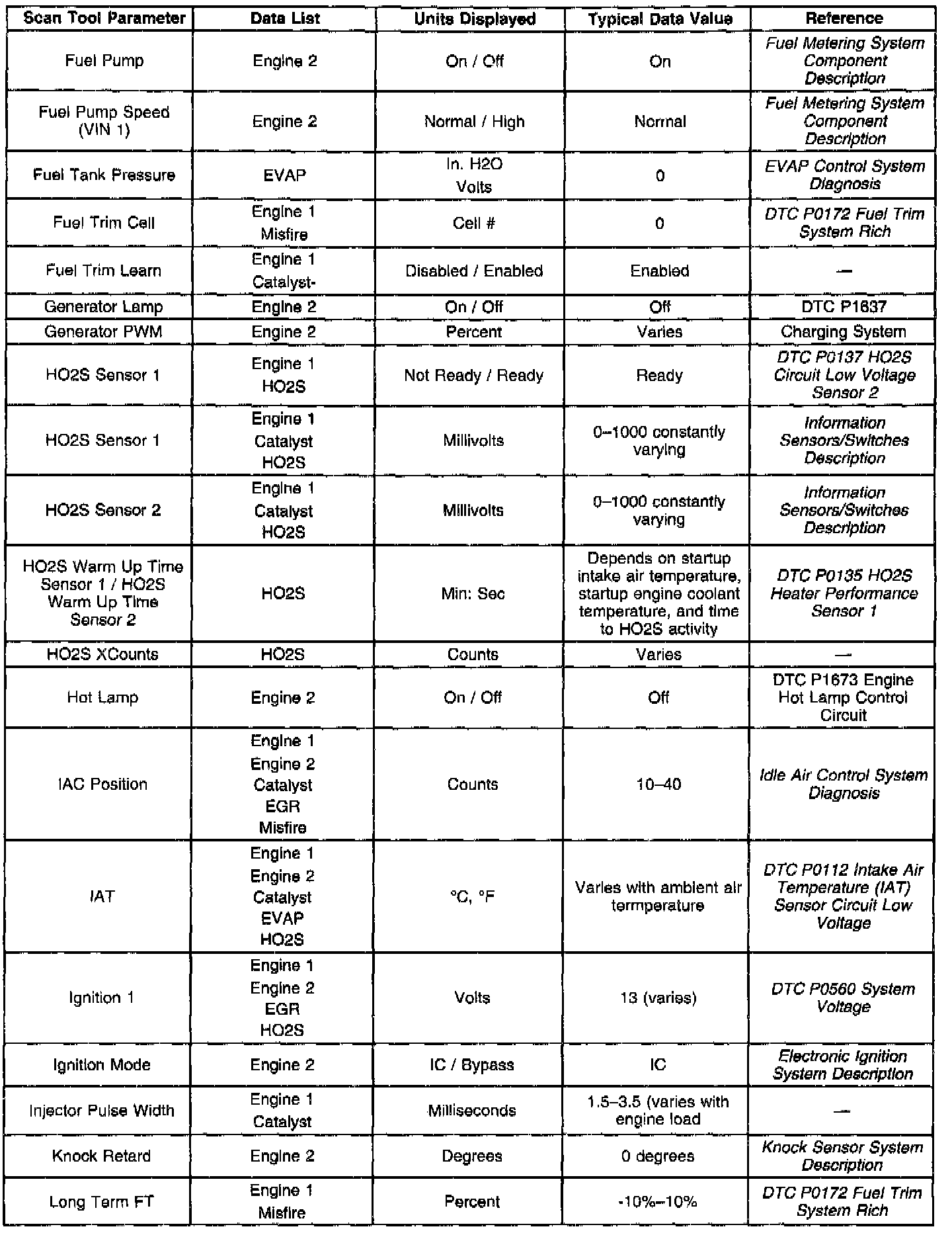 Use the Typical Scan Data Values table only after the Powertrain On-Board Diagnostic System Check has been completed, no DTC(s) were noted and you have determined the on-board diagnostics are functioning properly. Scan tool values from a properly running engine may be used for comparison with the engine you are diagnosing. The Typical Scan Data values represent values that would be seen on a normally running engine.