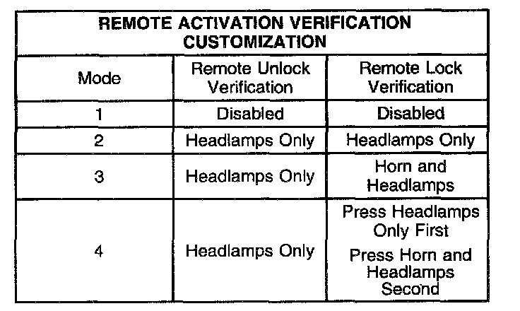 2. Turn the ignition to the ACC position. The seat belt telltale flashes and the chime bongs 1-4 times, equal to the current customization mode. This indicates which mode the vehicle is in. Each time the transmitter LOCK button is pressed, the mode number advances. A transition past mode 4 will repeat, starting again at mode 1.
