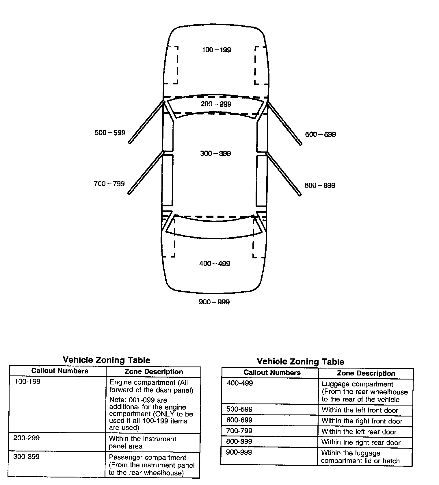 All grounds, in-line connectors, pass-through grommets, and splices have identifying numbers that correspond to where they are located in the vehicle. The above table explains the numbering system.