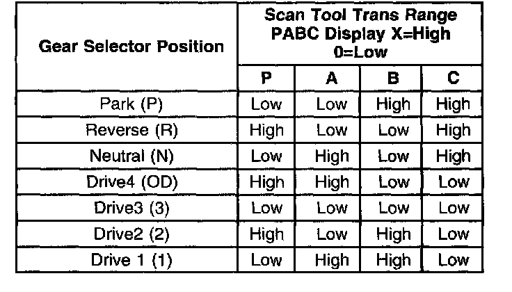 This information is used for transmission shift control, ignition timing, EVAP canister purge, EGR and IAC valve operation. The combination of the four transaxle range input states determine the PCM commanded shift pattern. The input voltage level at the PCM is high (B+) when the transaxle range switch is open and low when the switch is closed to ground. The state of each input is represented on the scan tool as High voltage level, Low voltage level. The four parameters represent transaxle range switch Parity, A, B, and C inputs respectively. Valid transaxle range input combinations are shown in the Transaxle Range Switch Valid Input Combinations table.