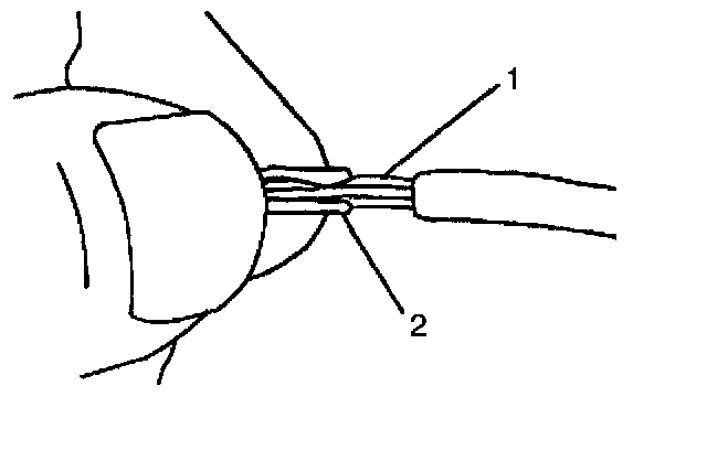 7. Center the splice clip (2) over the stripped wires (1) and hold the clip in place.