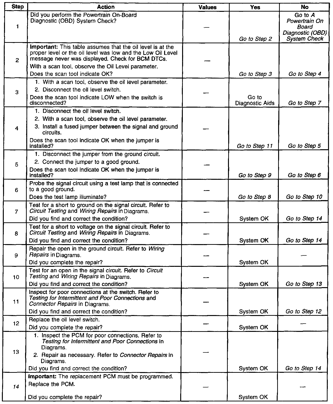^ The engine oil level switch circuit-If the problem with the Low Oil Level lamp cannot be isolated using the Engine Oil Level Switch Diagnostic table, use the PCM Controlled Lamps Diagnostic table.
