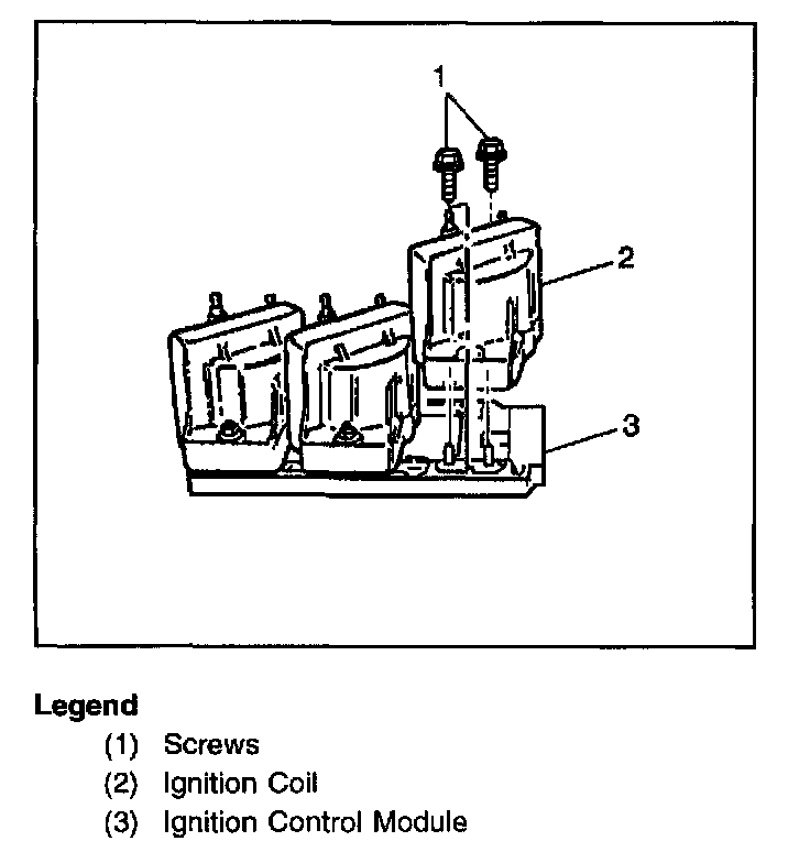 Three twin-tower ignition coils (2) are individually mounted to the ignition control module (3). Each coil provides spark for 2 plugs simultaneously. Each coil is serviced separately. Two terminals connect each coil pack to the module. Each coil is provided a fused ignition feed. The other terminal at each coil is individually connected to the module, which energizes one coil at a time by completing and interrupting the primary circuit ground path to each coil at the proper time.