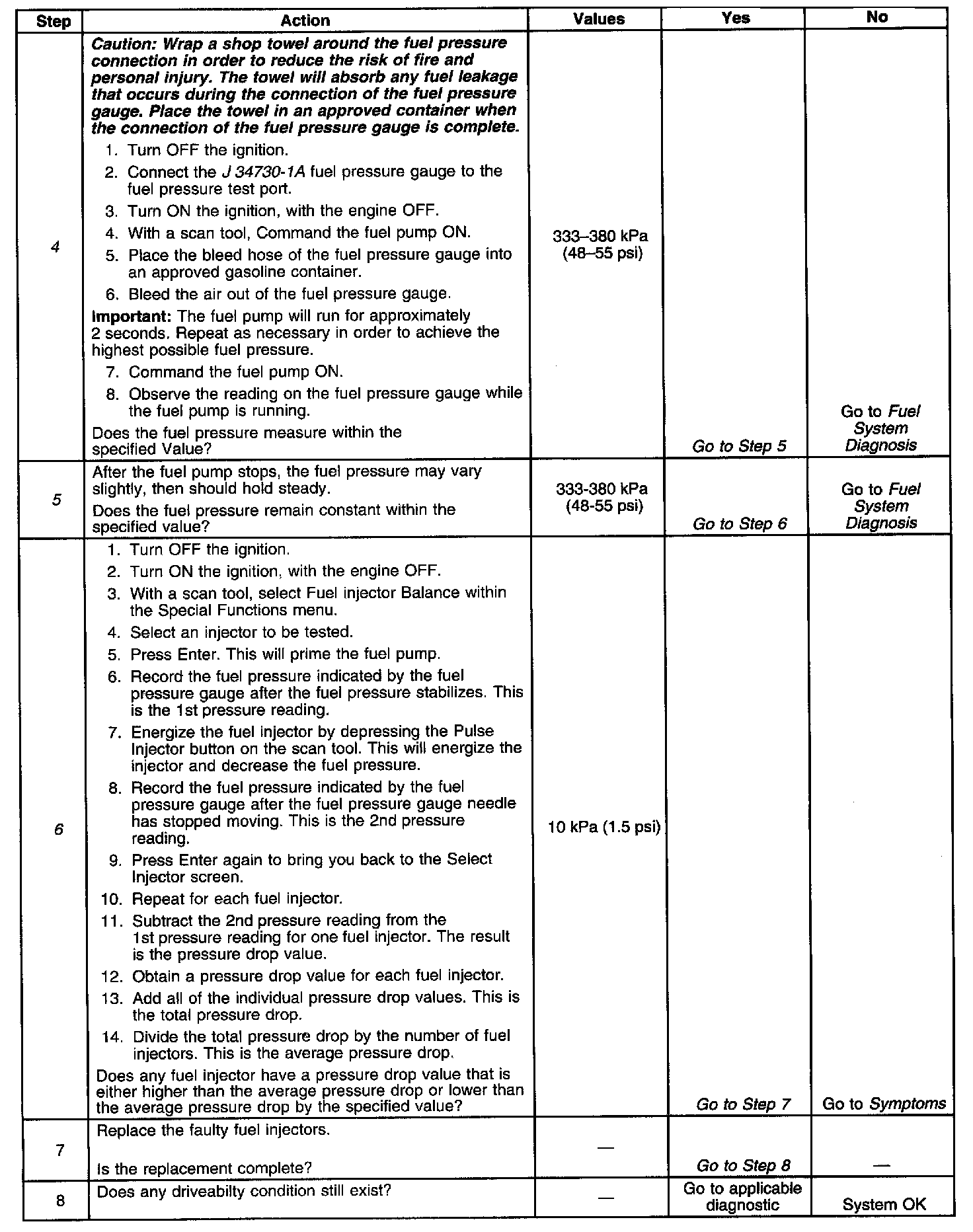 6. If the pressure drop value for each fuel injector is within 10 kPa (1.5 psi) of the average pressure drop value, the fuel injectors are flowing properly. Calculate the pressure drop value for each fuel injector by subtracting the second pressure reading from the first pressure reading.