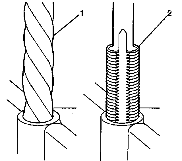 1. Drill out the threads of the damaged hole (1).