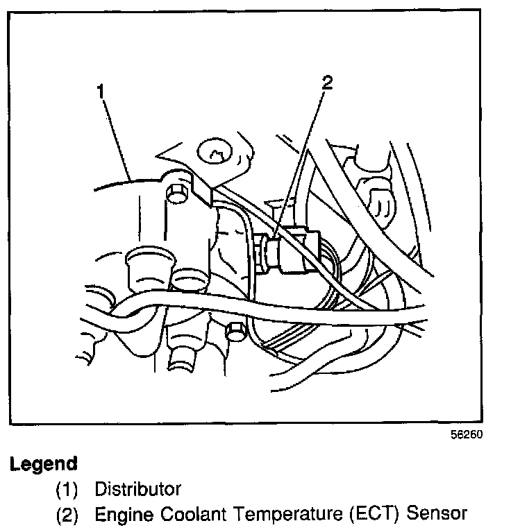 The Engine Coolant Temperature (ECT) sensor is located in the cylinder head near the ignition distributor. The ECT sensor is a thermistor (a variable resistor that changes value when the temperature changes). The ECT sensor is connected in series with a fixed resistor in the Powertrain Control Module (PCM). The PCM applies 5 volts to the ECT sensor. The PCM monitors the voltage drop across the ECT sensor and converts the voltage reading into a temperature value. The ECT sensor voltage reading at the PCM will vary with the changes in the engine temperature.