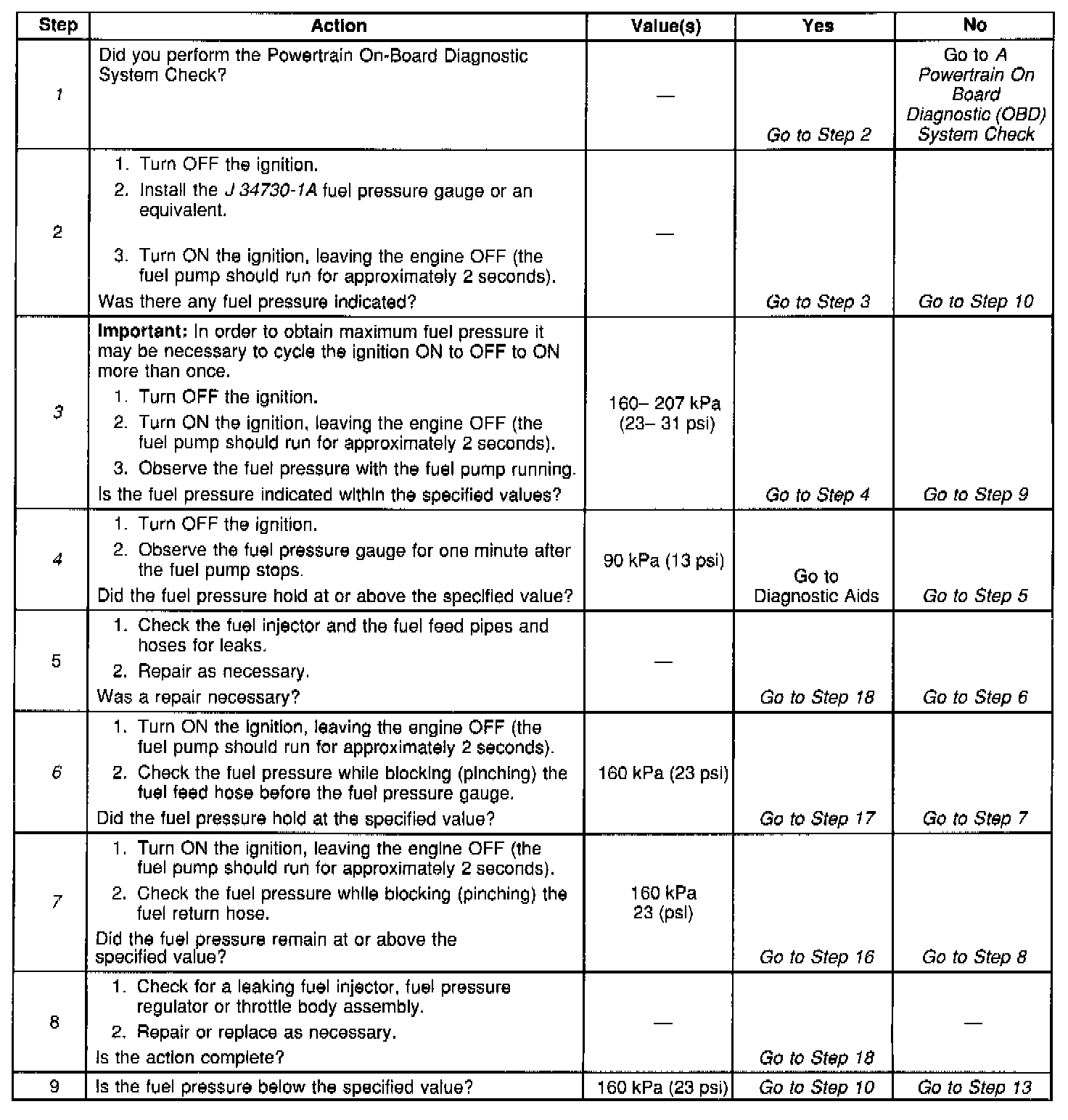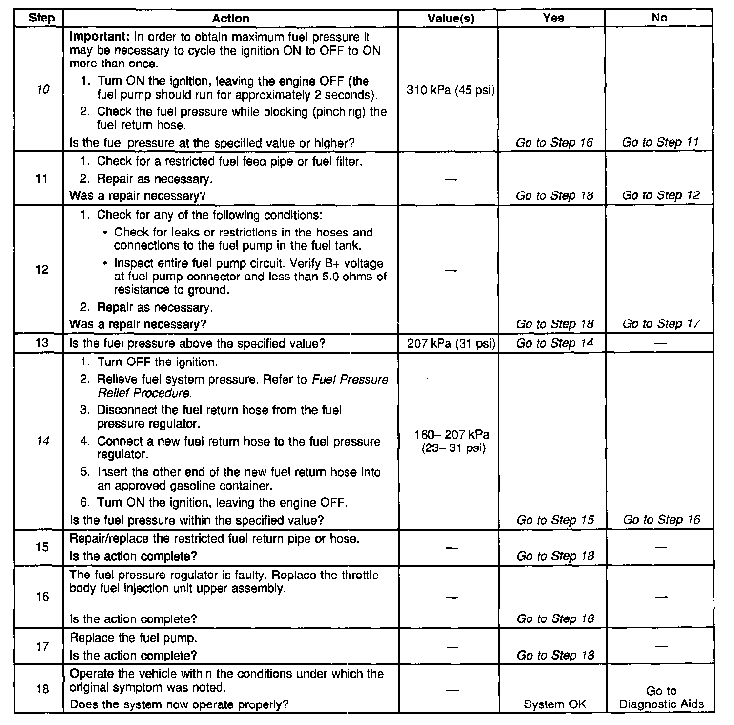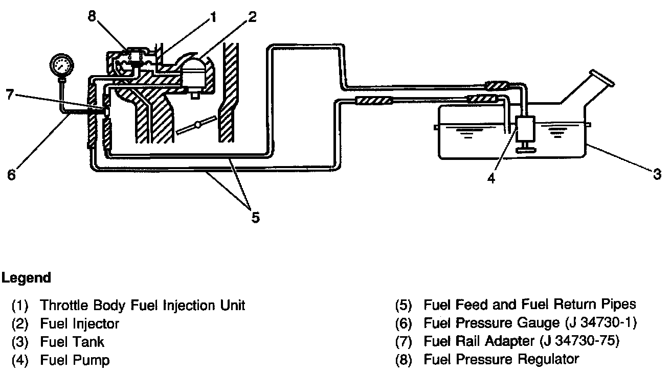 The fuel pump will deliver fuel to the fuel injector in the TBI unit at a controlled pressure. The controlled pressure is 160-210 kPa (23-31 psi) when the fuel pump is energized and the engine is not running. The controlled pressure is 90-140 kPa (13-20 psi). When the engine is idling at normal operating temperatures The fuel-pressure regulator maintains the correct fuel pressure at all times by returning excess fuel to the fuel tank.