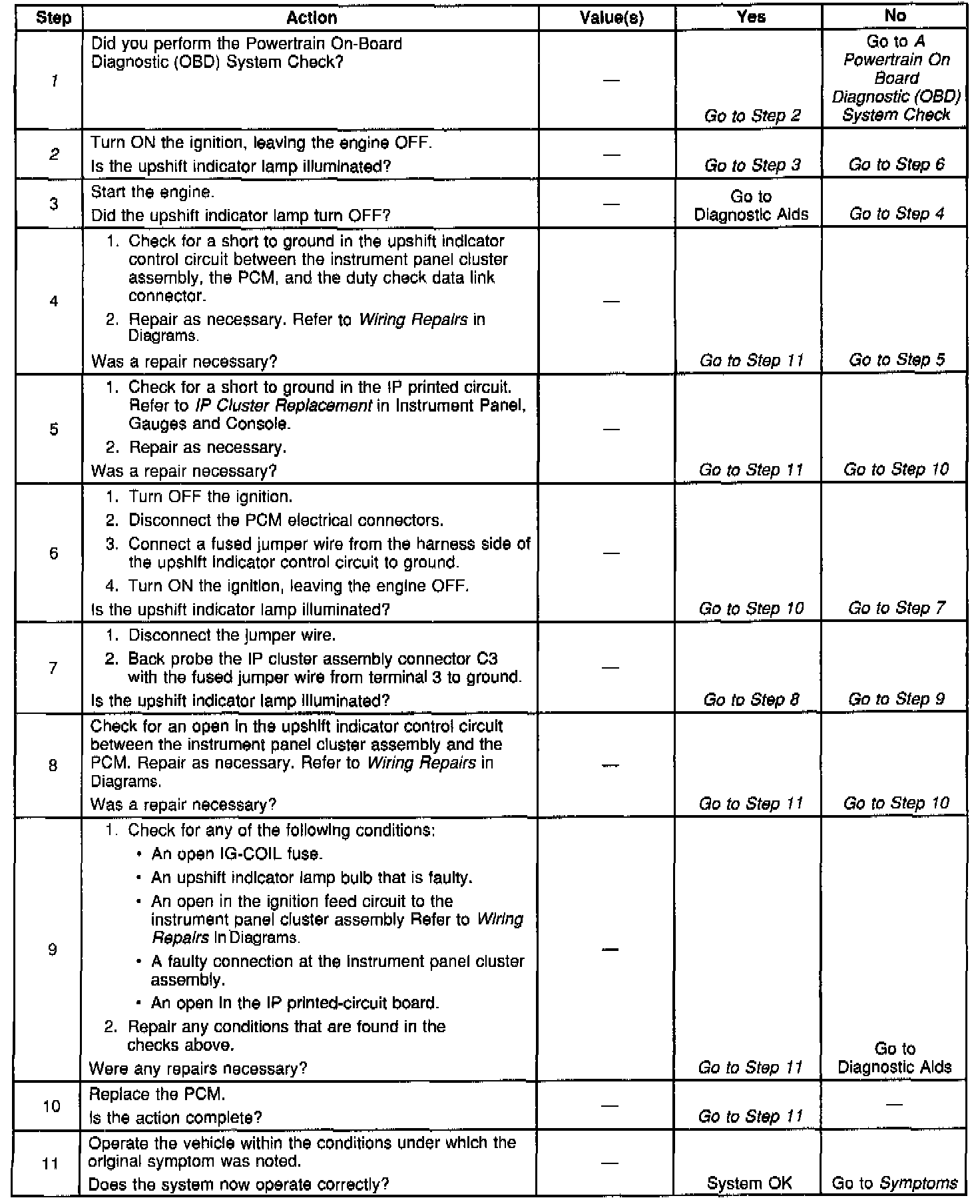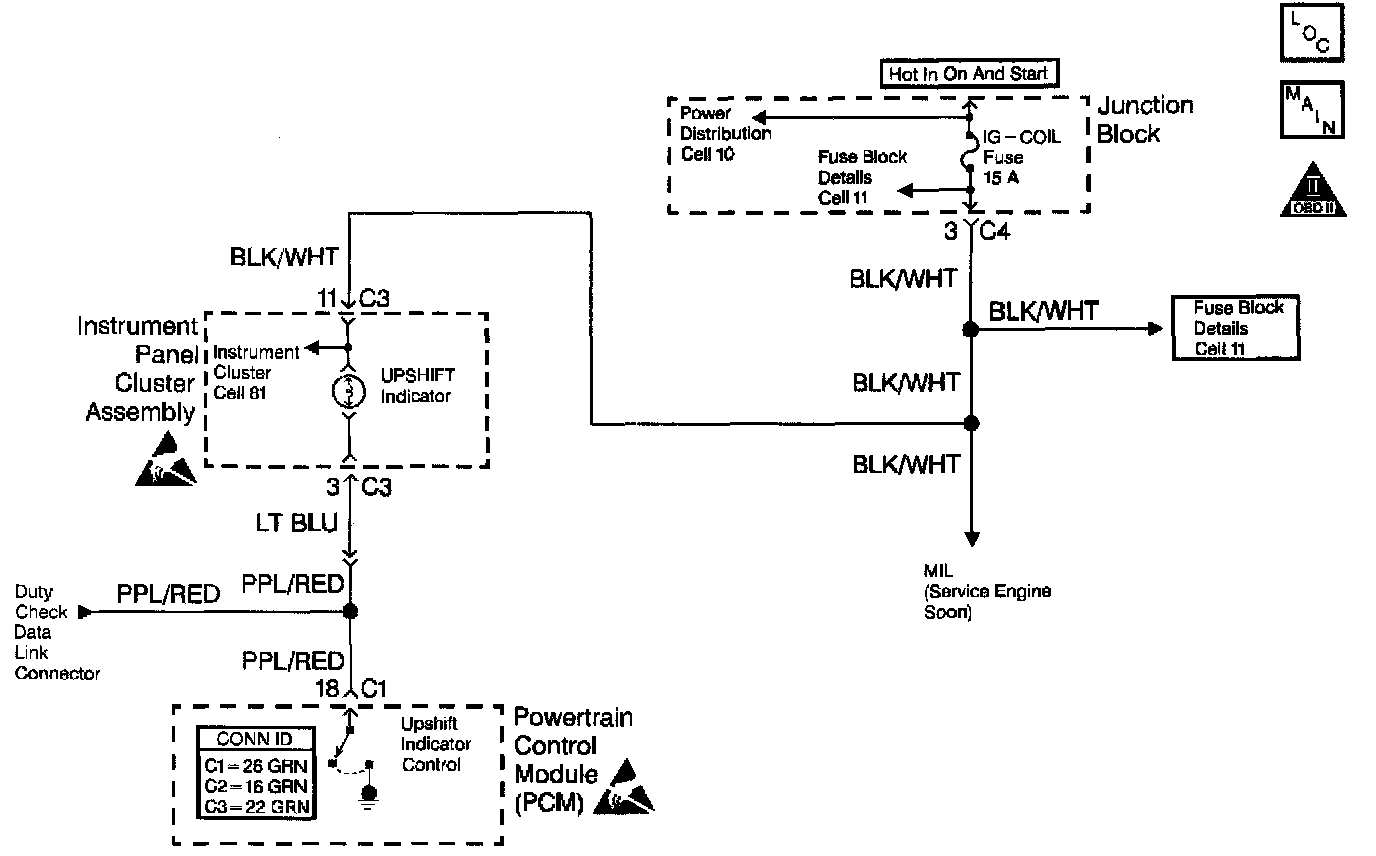 The Powertrain Control Module (PCM) controls the upshift indicator lamp. The upshift indicator lamp is illuminated when the upshift indicator control circuit from the instrument panel cluster assembly is grounded by the PCM. The upshift indicator lamp will be illuminated all the time if the lamp control circuit is shorted to ground. The lamp will not illuminate if the upshift indicator lamp circuit is open.