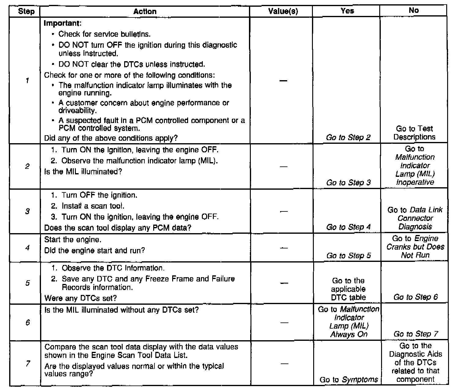 The Powertrain OBD system check is an organized approach to identifying a problem that is created by an engine control system malfunction. The Powertrain OBD System Check is the starting point for diagnosis of any driveability concern. The system check directs the service technician to the next logical step in diagnosing the concern. Understanding the table and using the table correctly will reduce diagnostic time, and prevent the replacement of good parts.