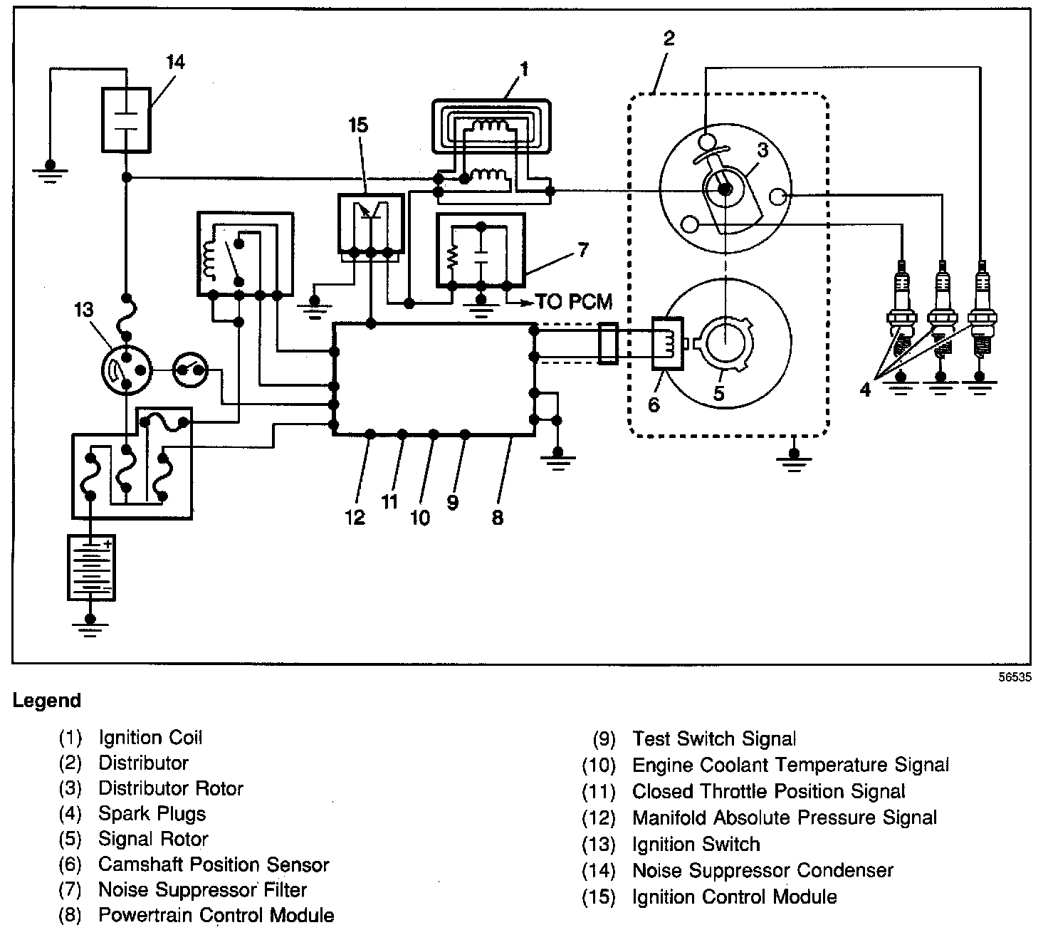The Powertrain Control Module (PCM) controls the ignition timing in ignition system. The PCM receives information on engine status from the engine sensors. The PCM then selects the most appropriate ignition timing settings from within the PCM's programming. No vacuum or mechanical advance mechanisms are used. The ignition system includes a noise suppressor filter to eliminate ignition sound. The noise suppressor filter also provides the tachometer (if equipped) with an ignition signal. Periodic lubrication of the distributor is not required.