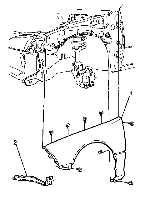 1. Slide the front fender (1) onto the side slider of the bumper. Position the fender (1) on the vehicle. Secure the front fender to the front fender brace (2) with the bolt.