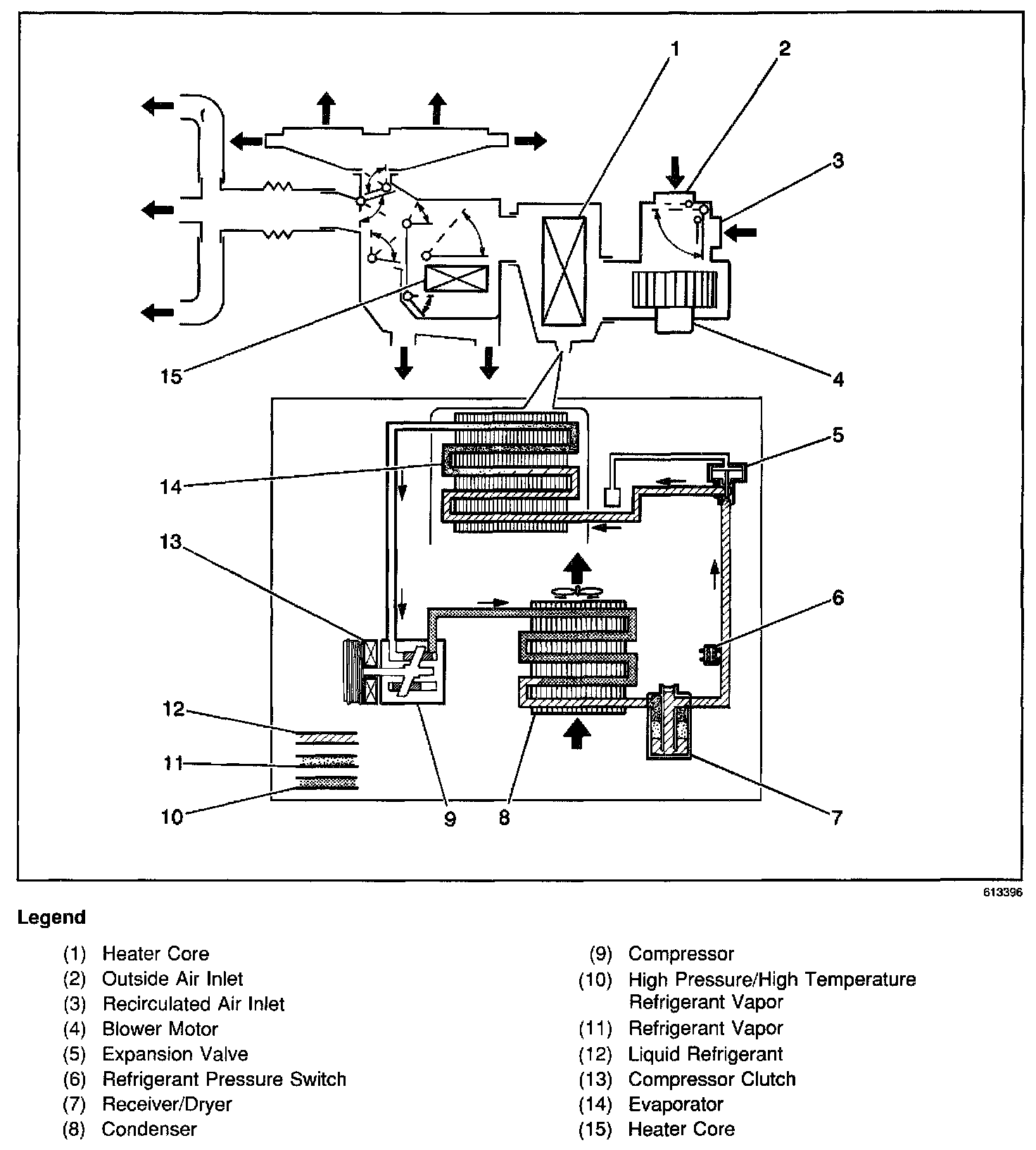 From the evaporator case some of the air, or all of the air may pass through the heater core. The engine coolant warms the heater core. The ambient air that bypassed the heater core mixes with the heated air before entering the passenger compartment.