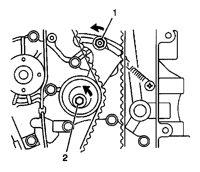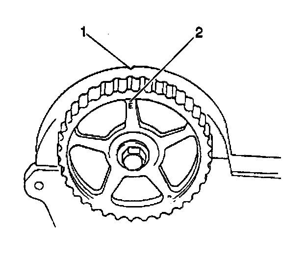 Ensure that you align the mark on the camshaft timing belt pulley (2) with the V on the inside of the timing belt cover (1).