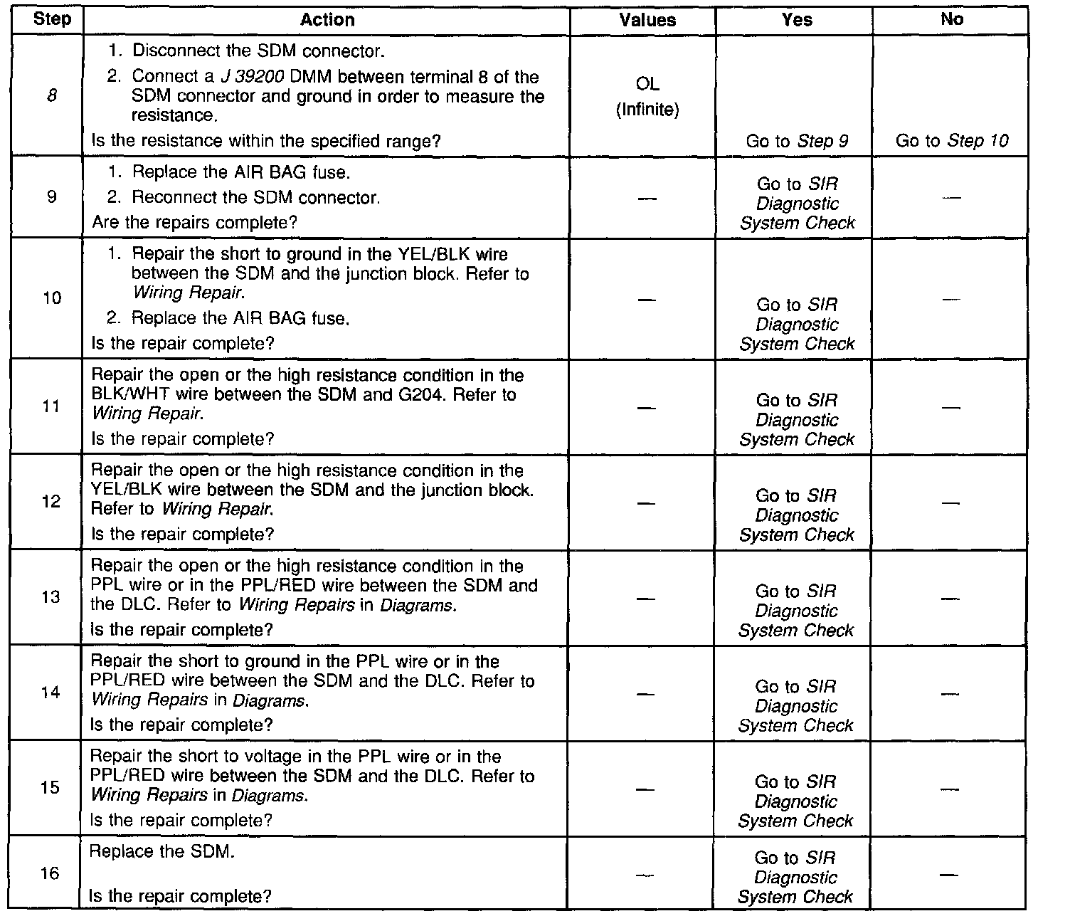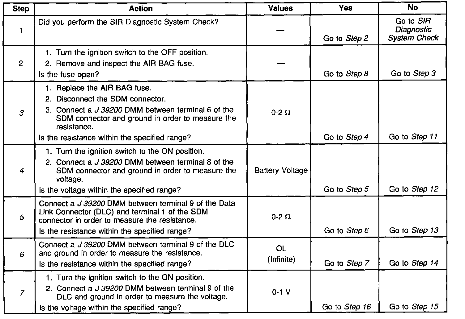 When measurements are requested in this table, use J39200 Digital Multimeter with the correct terminal adapter from J 35616-A Connector Test Adapter Kit. When a wire, connector or terminal repair is requested, use J38 125-B Terminal Repair Kit and refer to Wiring Repair.