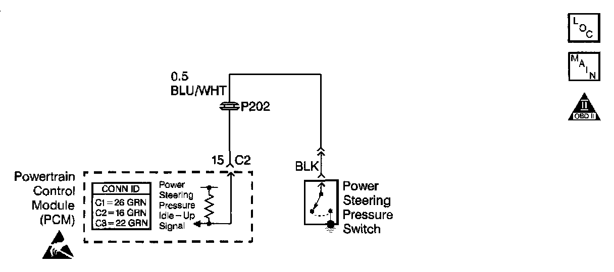 The voltage signal from the PSP switch to the PCM indicates less than one volt when the PSP switch is closed. The voltage signal is near battery voltage when the PSP switch is open.
