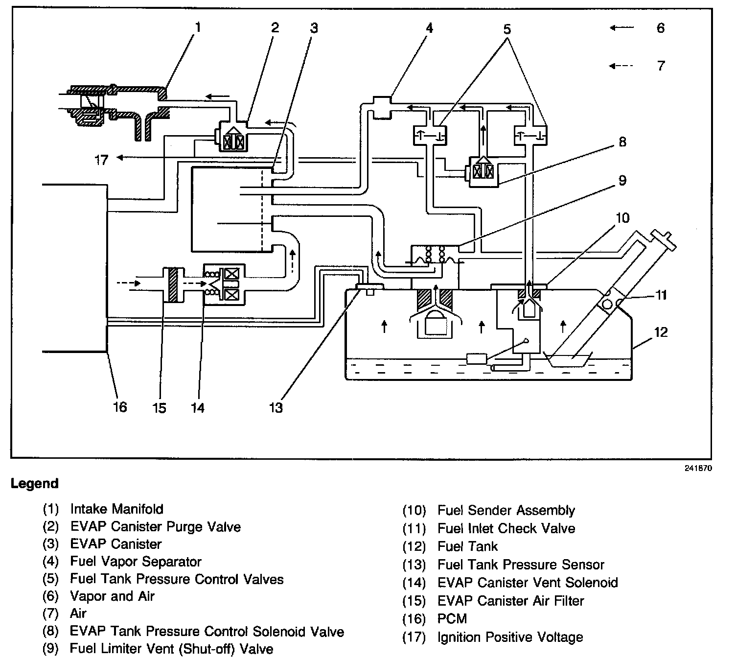 The fuel tank pressure control valve(s) is a pressure operated switching device. The fuel tank pressure control valve controls the vapor pressure in the fuel tank. The fuel tank pressure control valve is normally closed and blocks the fuel tank vapors from entering the EVAP canister unless the vapor pressure in the fuel tank is great. When the pressure of the vapor generated in the fuel tank becomes greater than a specified pressure, the vapor pushes past the fuel tank pressure control valve diaphragm and enters the EVAP canister. When the vapor pressure in the fuel tank is low (negative pressure), the fuel tank pressure control valve allows air to flow into the fuel tank. The fuel tank pressure control valves are located on top of the fuel tank.