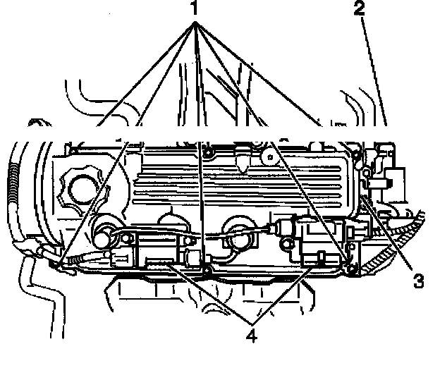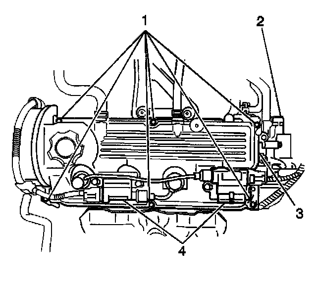 3. Remove the two ignition coils (4) and the secondary spark plug wires from the valve rocker-arm cover.