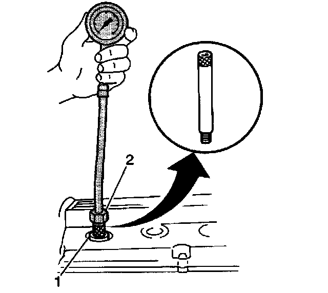 6. Install a compression gauge (2) into a spark plug hole. If necessary use an extension for the compression gauge.