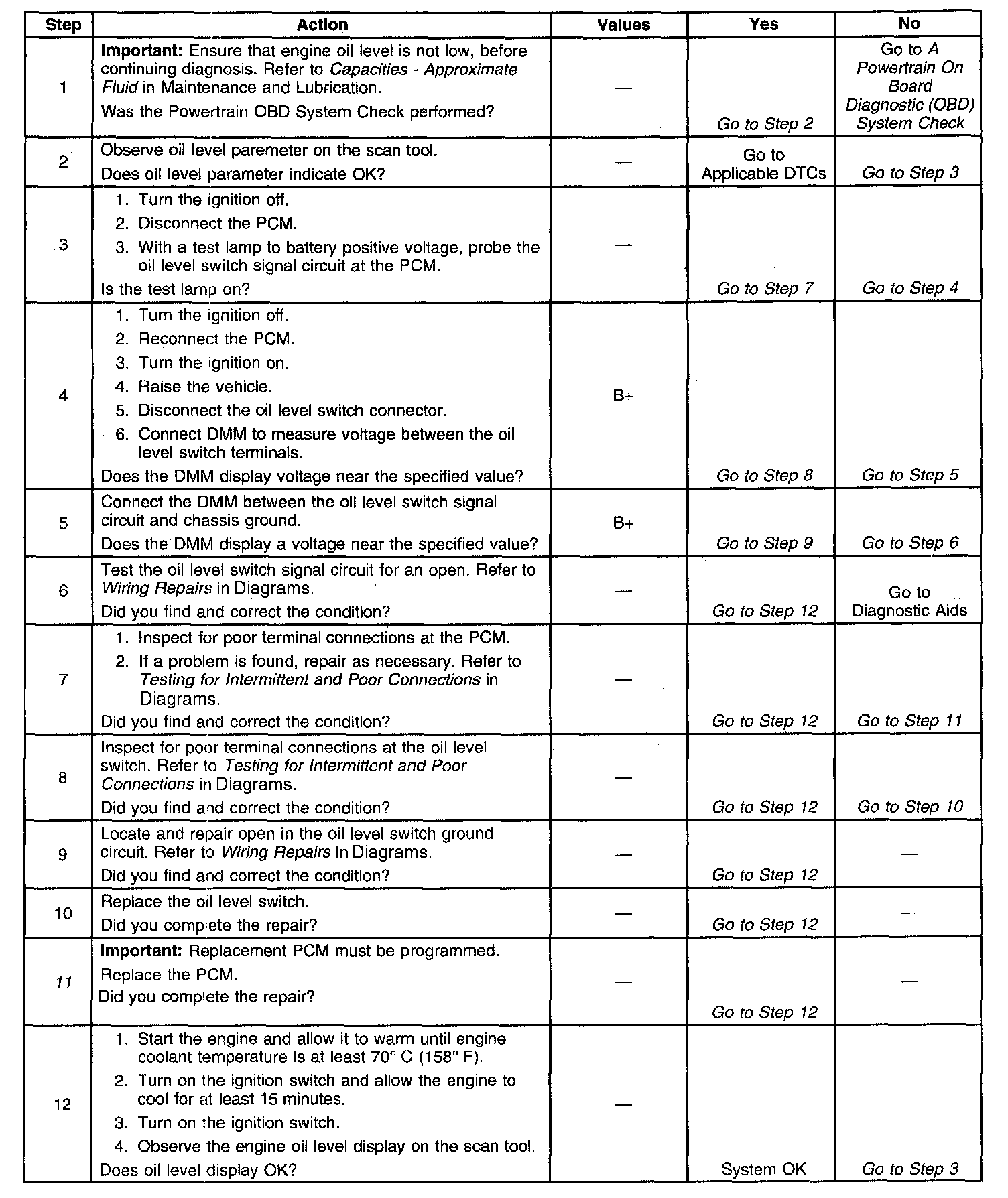 12. For the PCM to check engine oil level, start-up engine coolant temperature must be at least 12°C (22°F) cooler than the engine coolant temperature was last time the ignition was turned off. Allowing the engine to warm and then cool ensures that the PCM checks the engine oil level switch and that the information displayed on the scan tool is current.