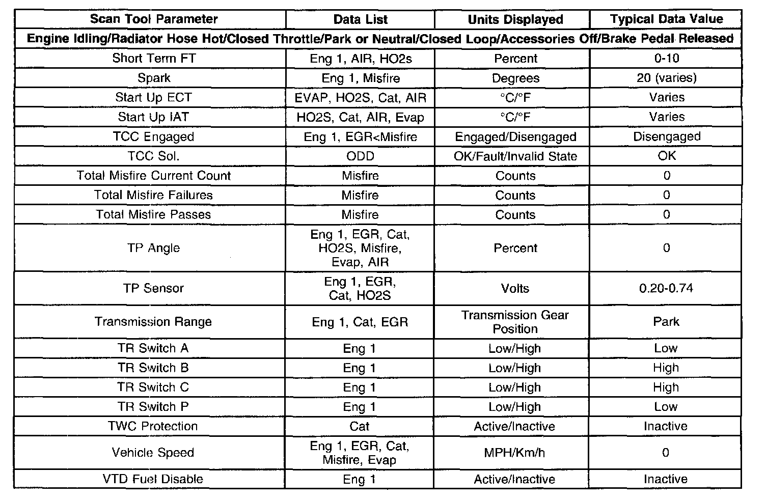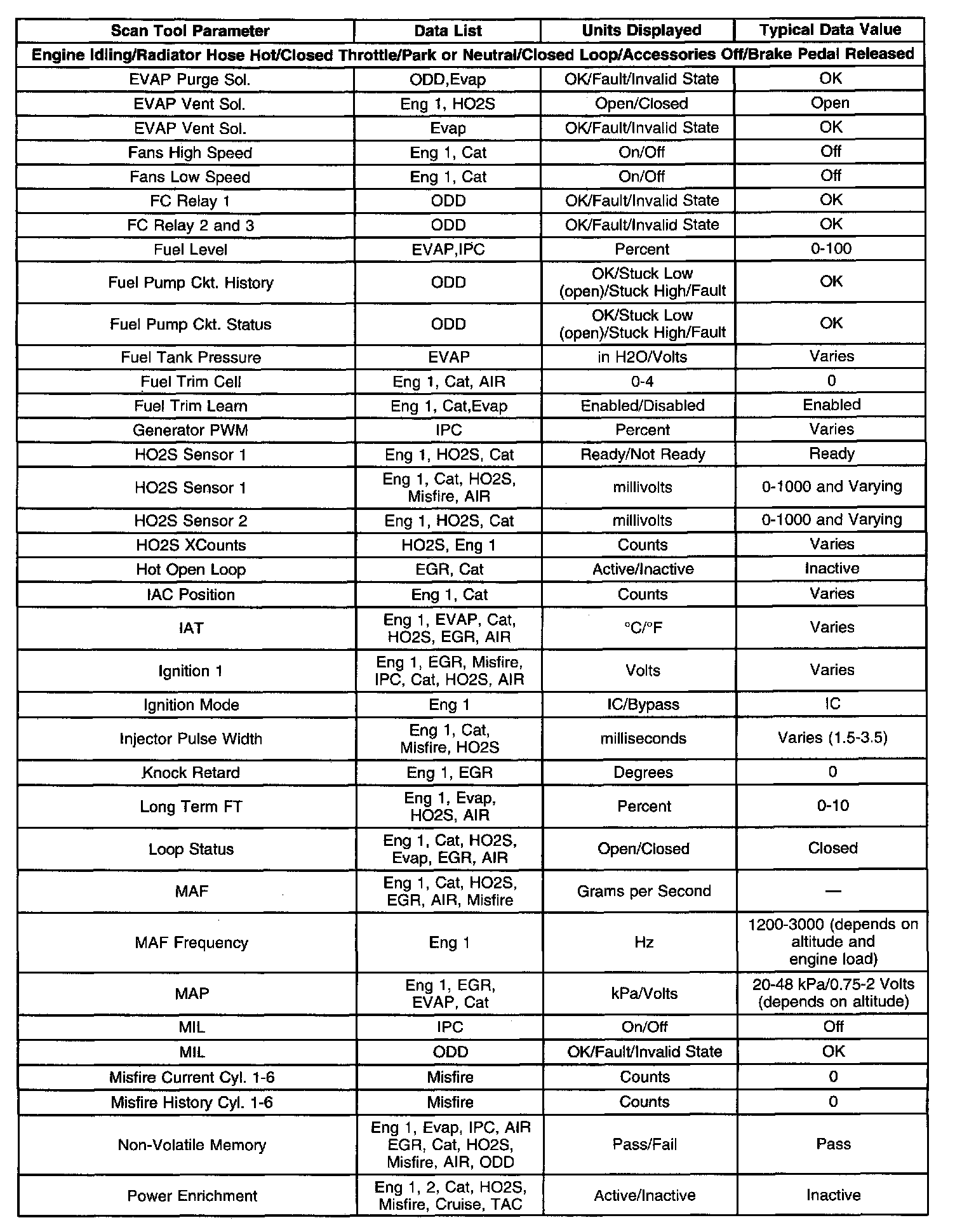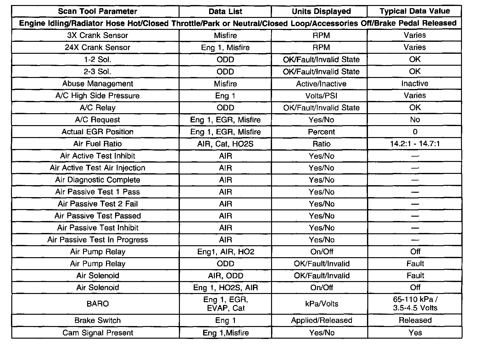 The column labeled Data List indicates where a parameter can be located on the scan tool. Refer to the scan tool operating manual for the exact locations of the data lists. The following is a description of each term listed: