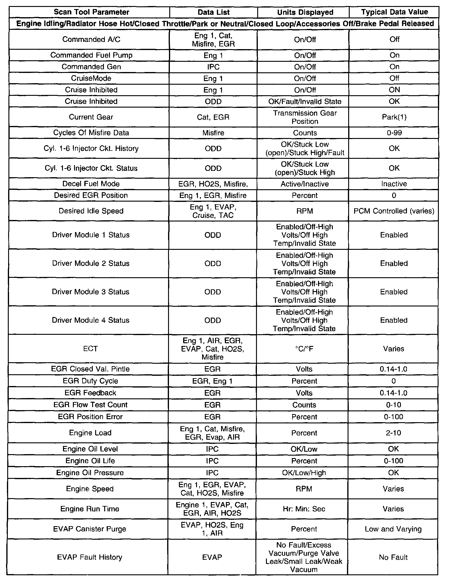Scan tool values from a properly running engine may be used for comparison with the engine you are diagnosing. The Engine Scan Tool Data List represents values that would be seen on a normally running engine.