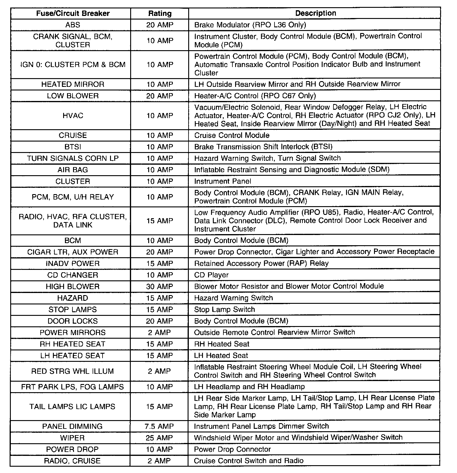 Instrument Panel Fuse Block, Fuse Application Table: