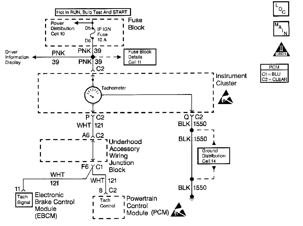 The PCM supplies the ground to energize the Instrument Cluster tachometer. When the ignition switch is first turned on the PCM grounds the tachometer circuit. The circuit will remain grounded until the PCM receives the first 18X reference pulse. Once the 18X reference pulse is received, the PCM controls the pulse frequency in relationship to engine RPM. The tachometer is controlled at a rate of two pulses per crankshaft revolution.