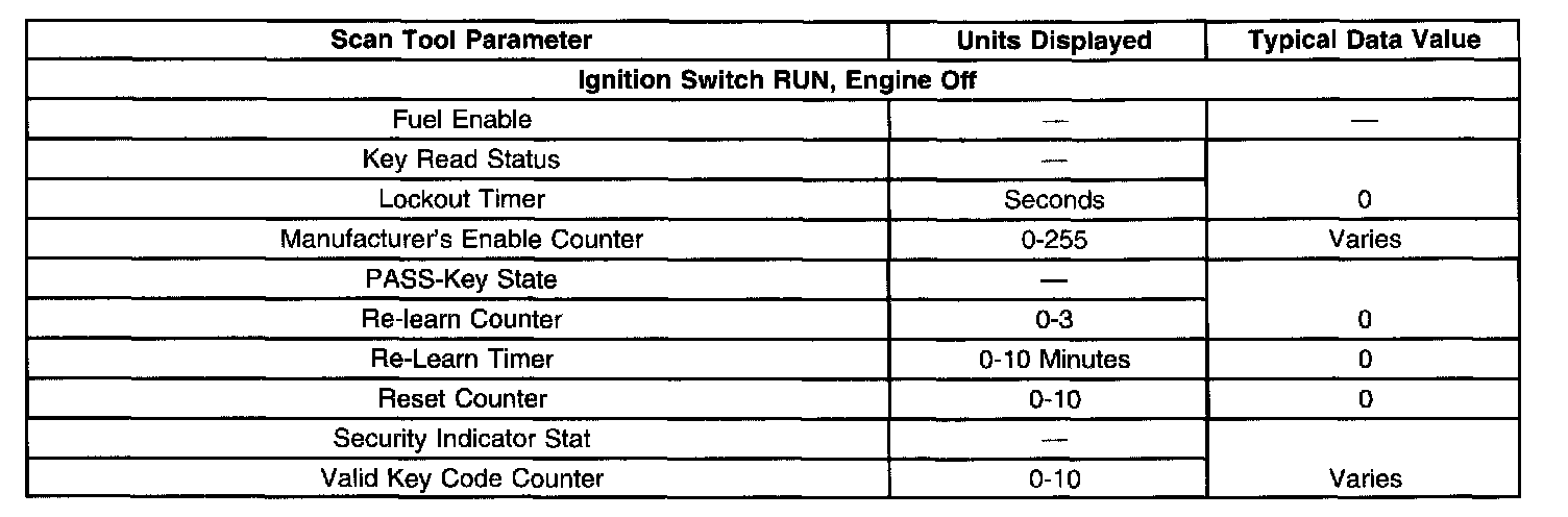 Manufacturer's Enable Counter: The number of ignition cycles that have occurred since the theft deterrent module was installed on the vehicle. This is restricted to 255 ignition cycles. This information is stored in non-volatile memory. The values are 0-255.