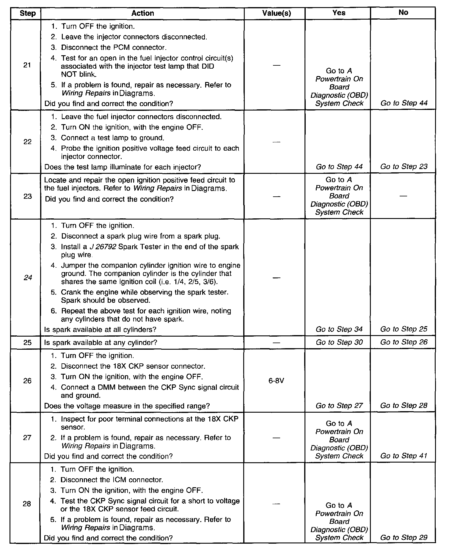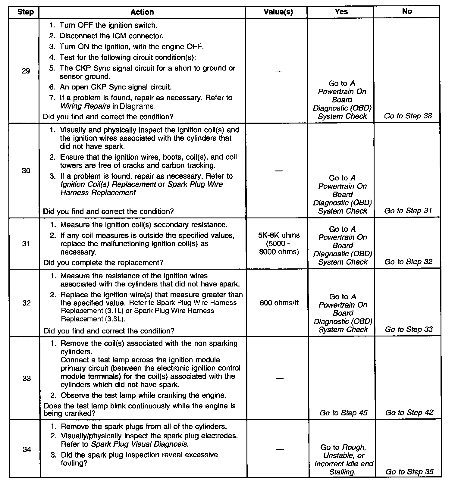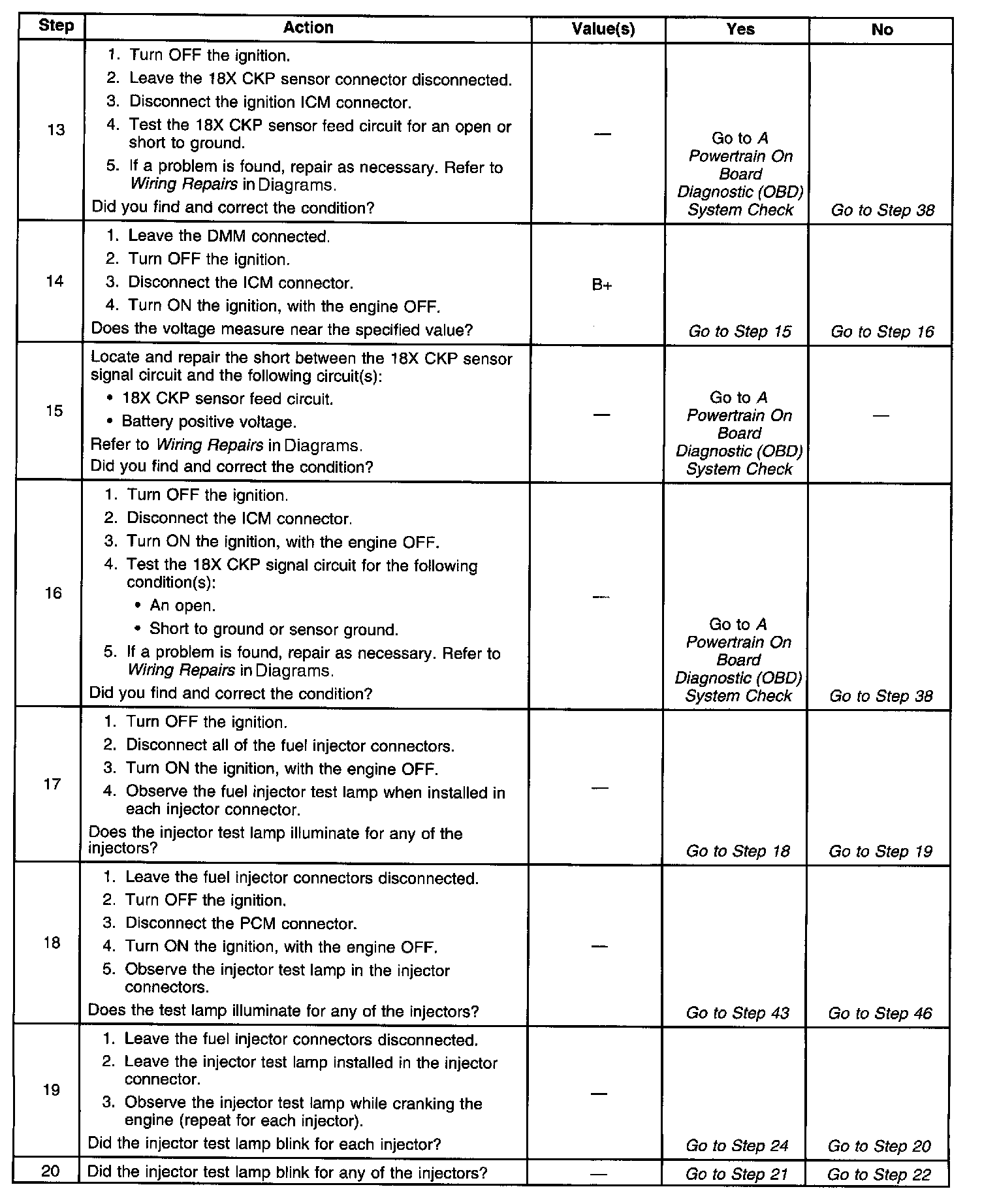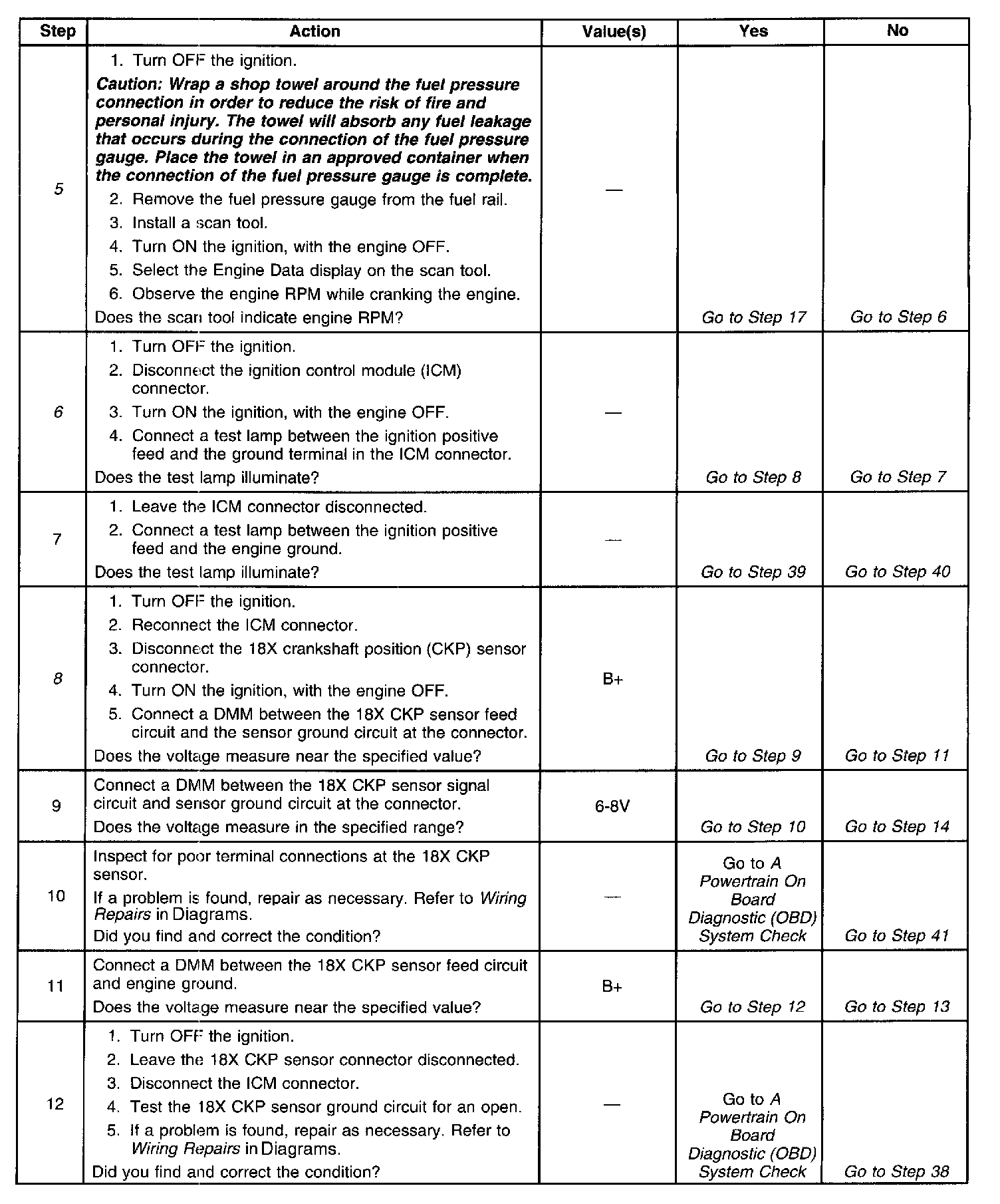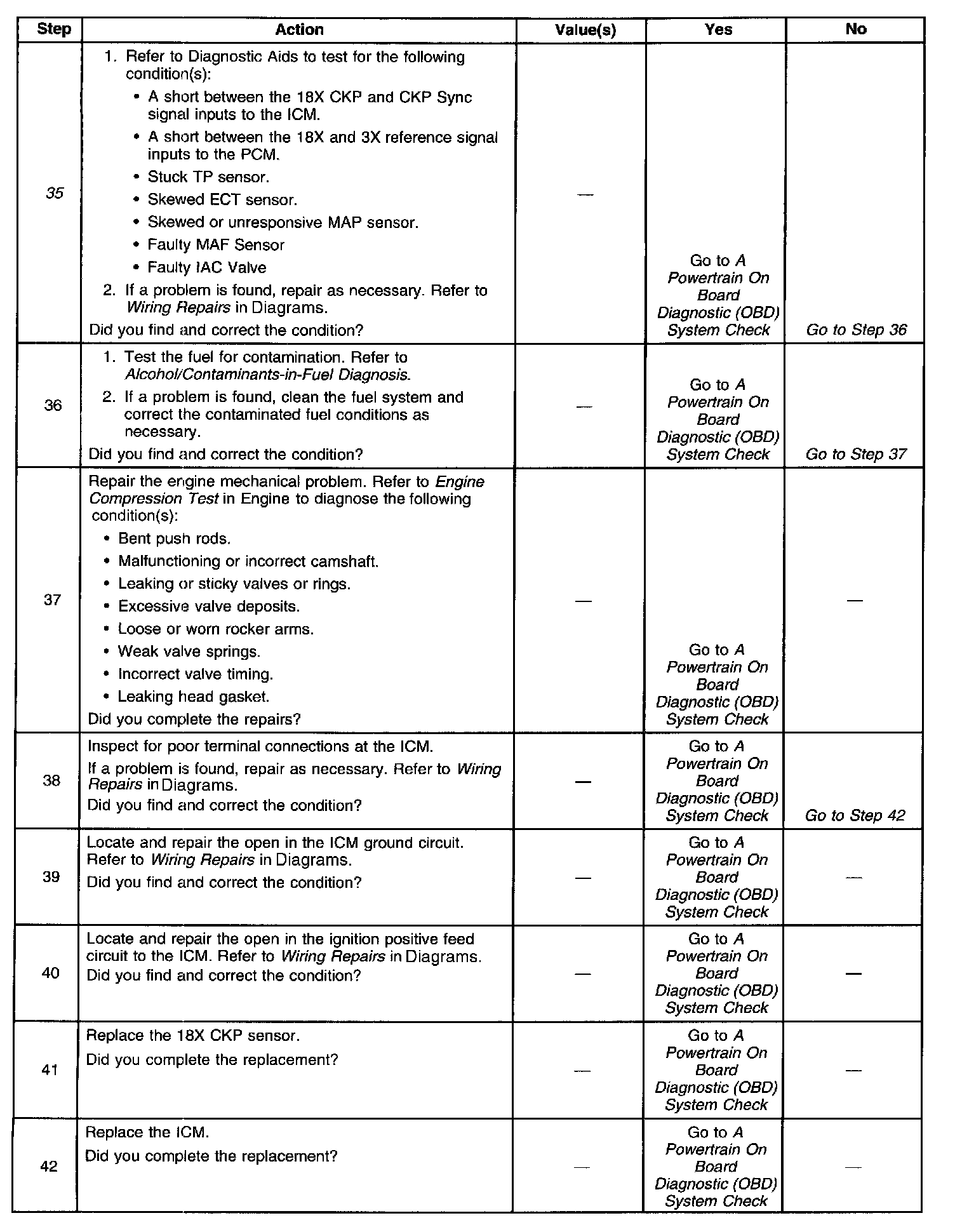 35. If the 18X and CKP Sync signals to the ICM or the 18X and 3X reference signals to the PCM short together the vehicle will not start and run. However, there will be spark and fuel injector pulses.