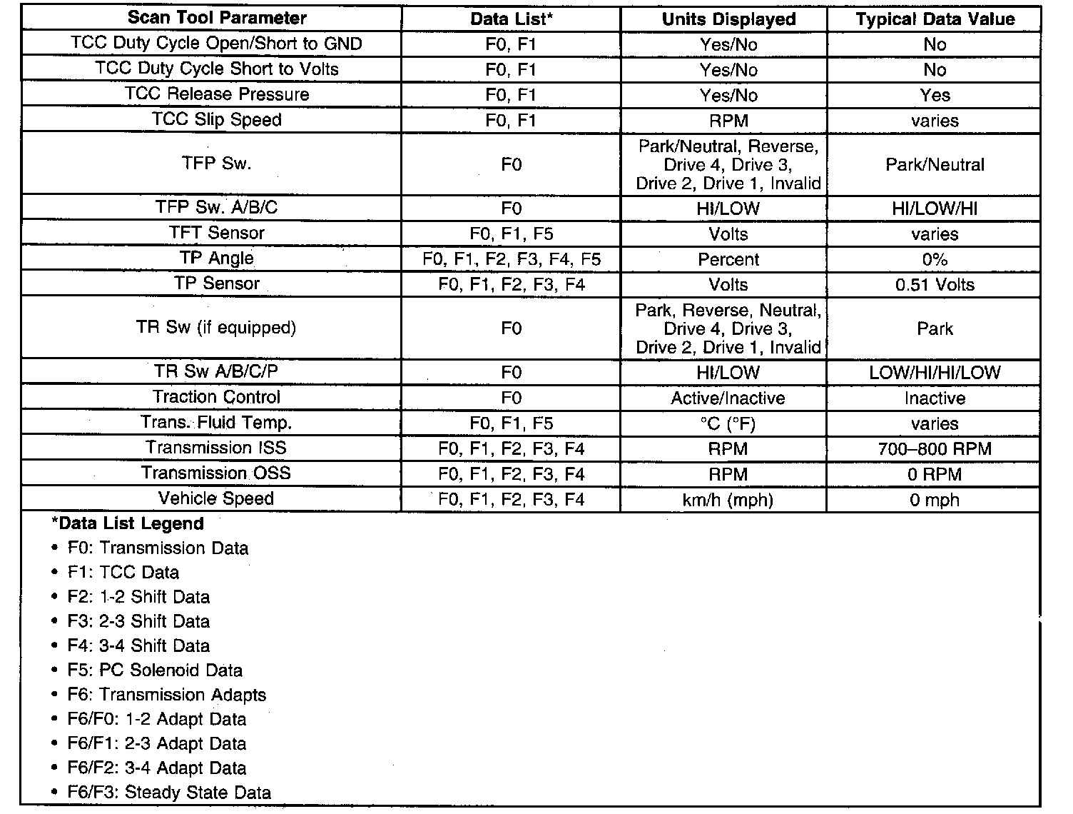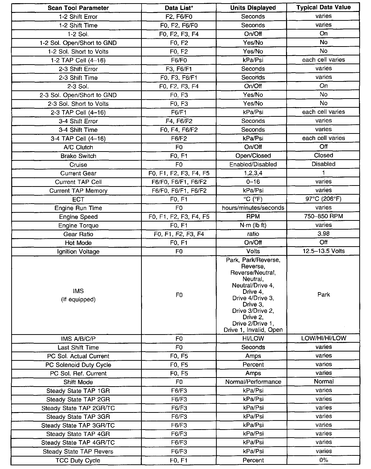 Only the parameters listed below are used for diagnosing. If a scan tool displays other parameters, the values are not recommended by General Motors for use in diagnosis. Scan tool values below were recorded under the following conditions:
