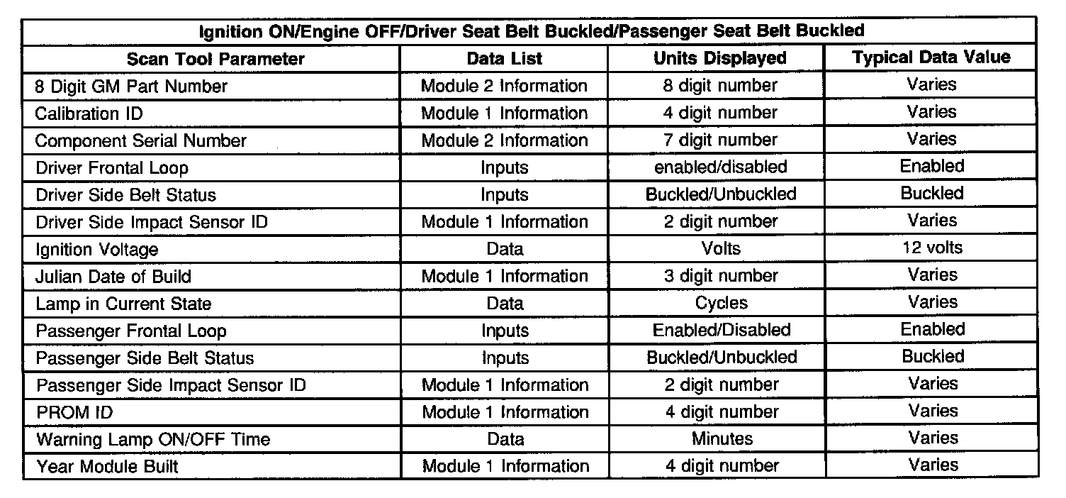 Use the SIR Scan Tool Data List as directed by a diagnostic table or in order to supplement the diagnostic procedures. Begin all of the diagnostic procedures with A Diagnostic System Check - SIR. Use the SIR Scan Tool Data List after the following is determined: