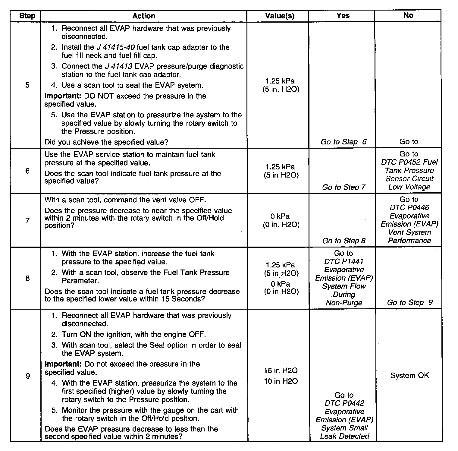A stuck closed EVAP canister purge valve, Stuck open EVAP vent valve, disconnected or damaged EVAP Purge line or vent hose, leaking fuel cap, or fill neck should set a DTC P0440. A small leak in the EVAP system should set a DTC P0442. An EVAP vent valve stuck closed, a restricted vent hose, or a blocked EVAP canister should set a DTC P0446. A continuous purge condition with no purge commanded by the PCM (EVAP purge valve stuck open or leaking) should set a DTC P1441. Refer to the DTC tables for further diagnostic procedures regarding the EVAP system.