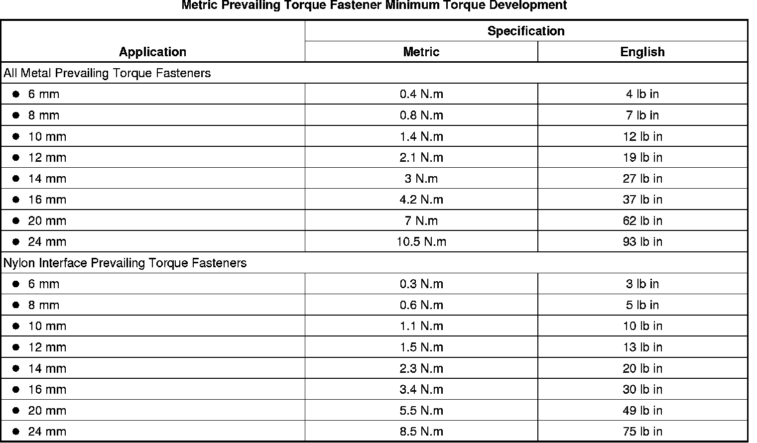 The metric fasteners on GM products are designed to new, international standards. The following are the common sizes and pitches, except for special applications: